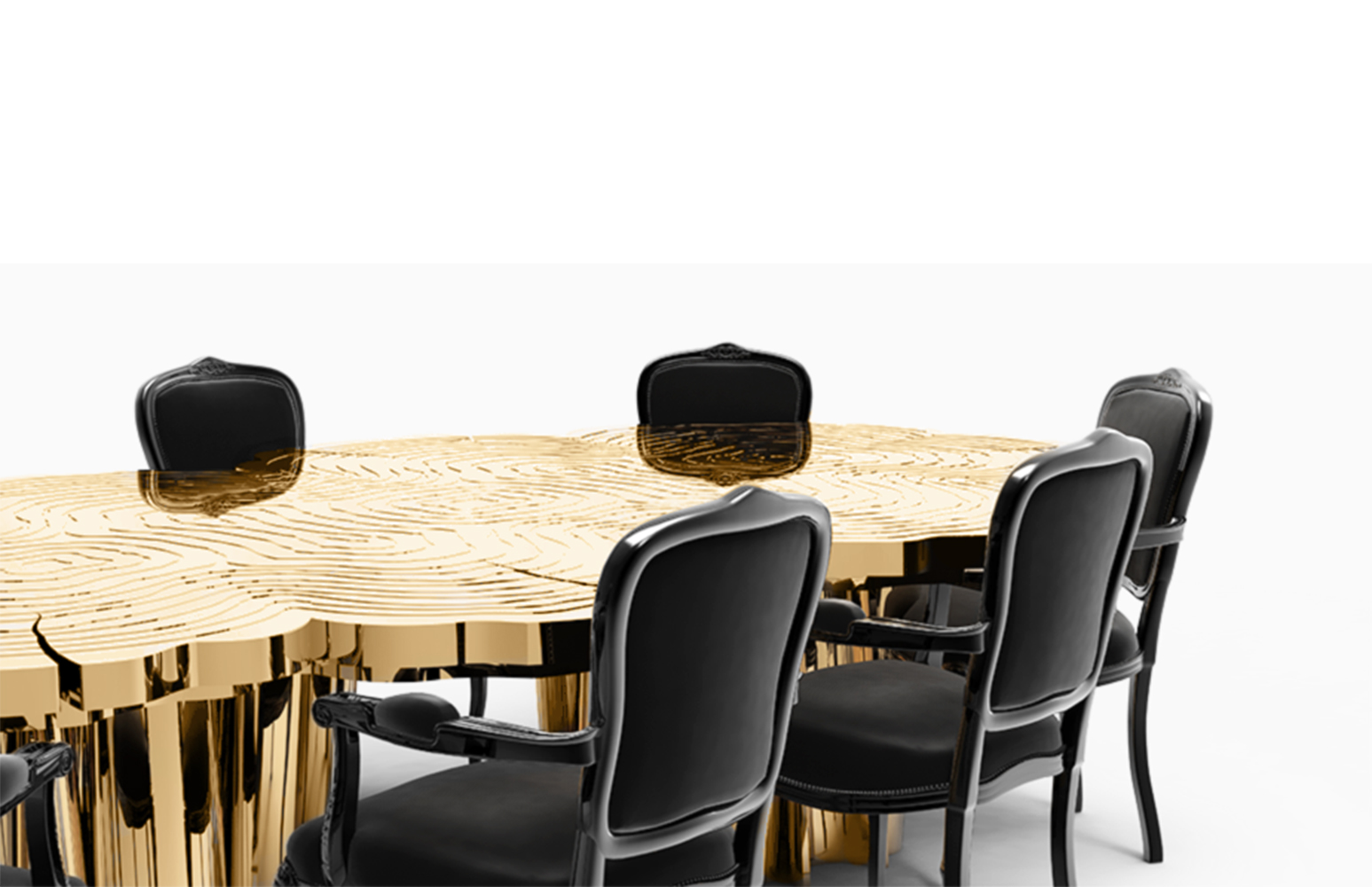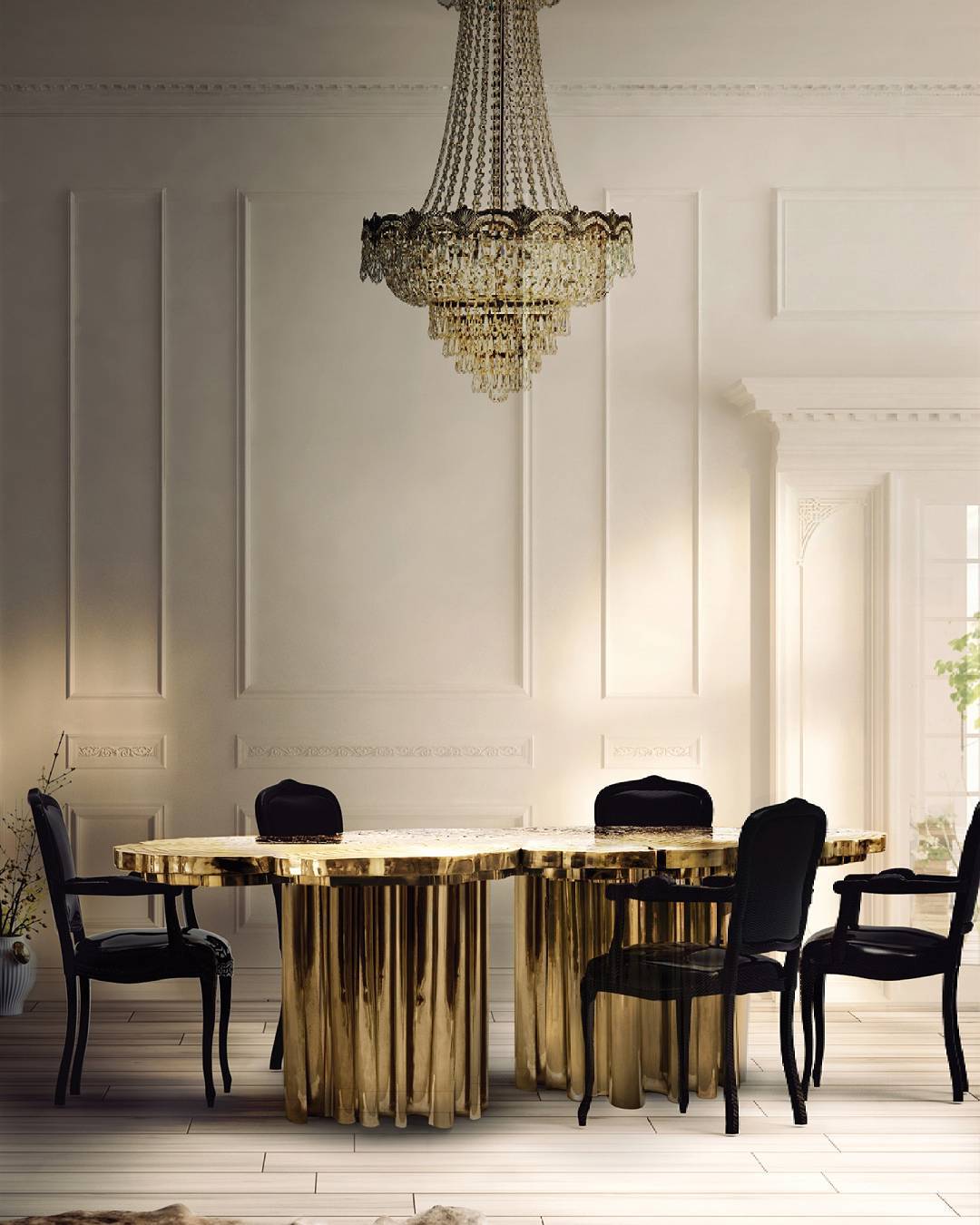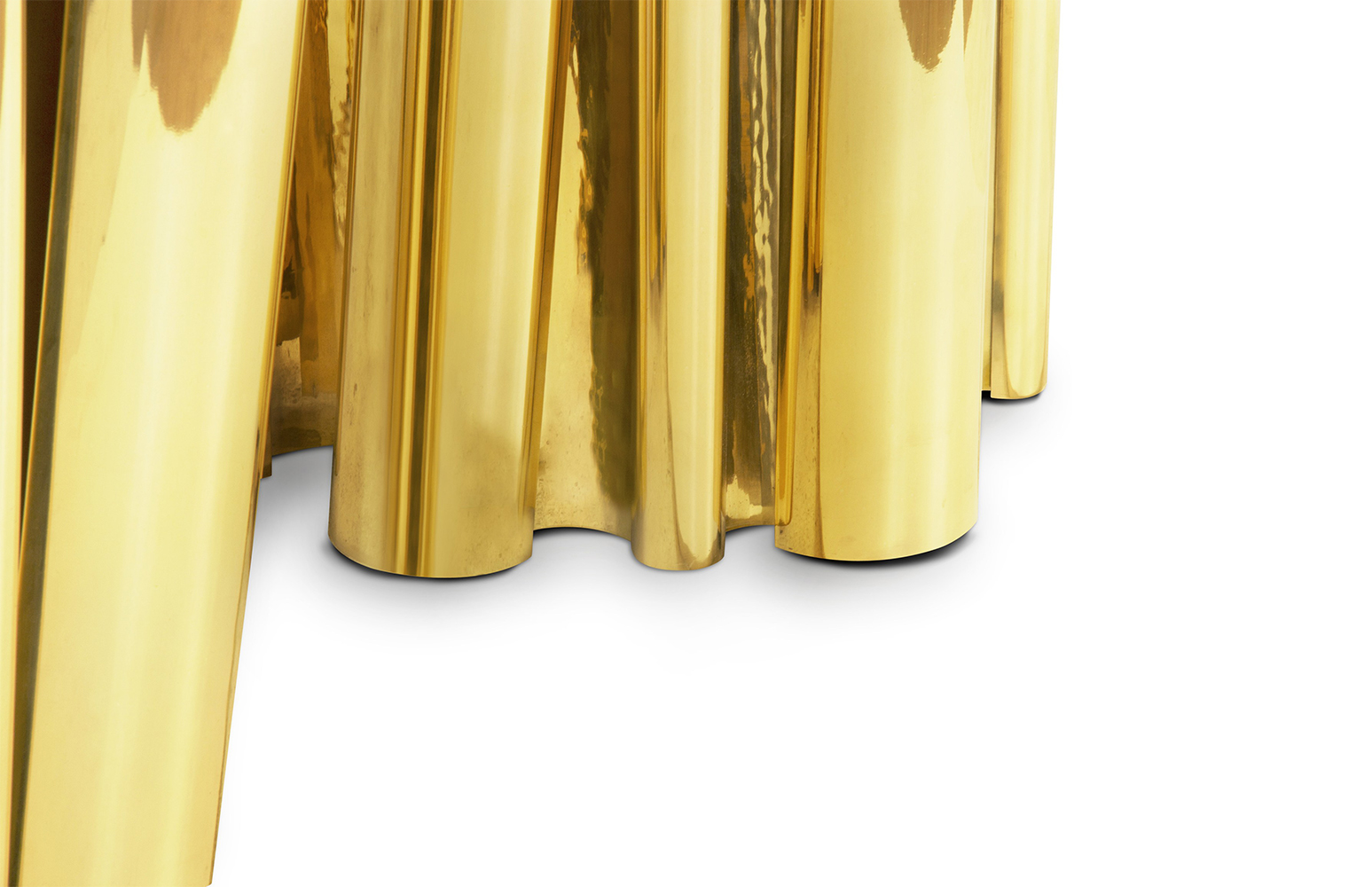A fresh contemporary dining table and a shimmering statement from Boca do Lobo. Fortuna represents the materialization of luck and fortune, a symbol of the control of life and the definition of fate. An elegant composition of scaled brass tubes supporting the outlines of log rings in brass, related do the time life of a tree. Available in iron and copper