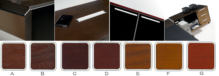 ※ Y型铝合金台面台脚连接件,巧妙处理木纹对接工艺,内藏式钢架,保证连接强度。※ 配置附柜,预设多功能线路管理系统,使得班台拥有强大文件储存功力,并保障现代办公自动化需求。 ※ 附件除抽屉外,带有抽拉式打印机,主机空格,人性设计,让每一设计都起到得要作用。