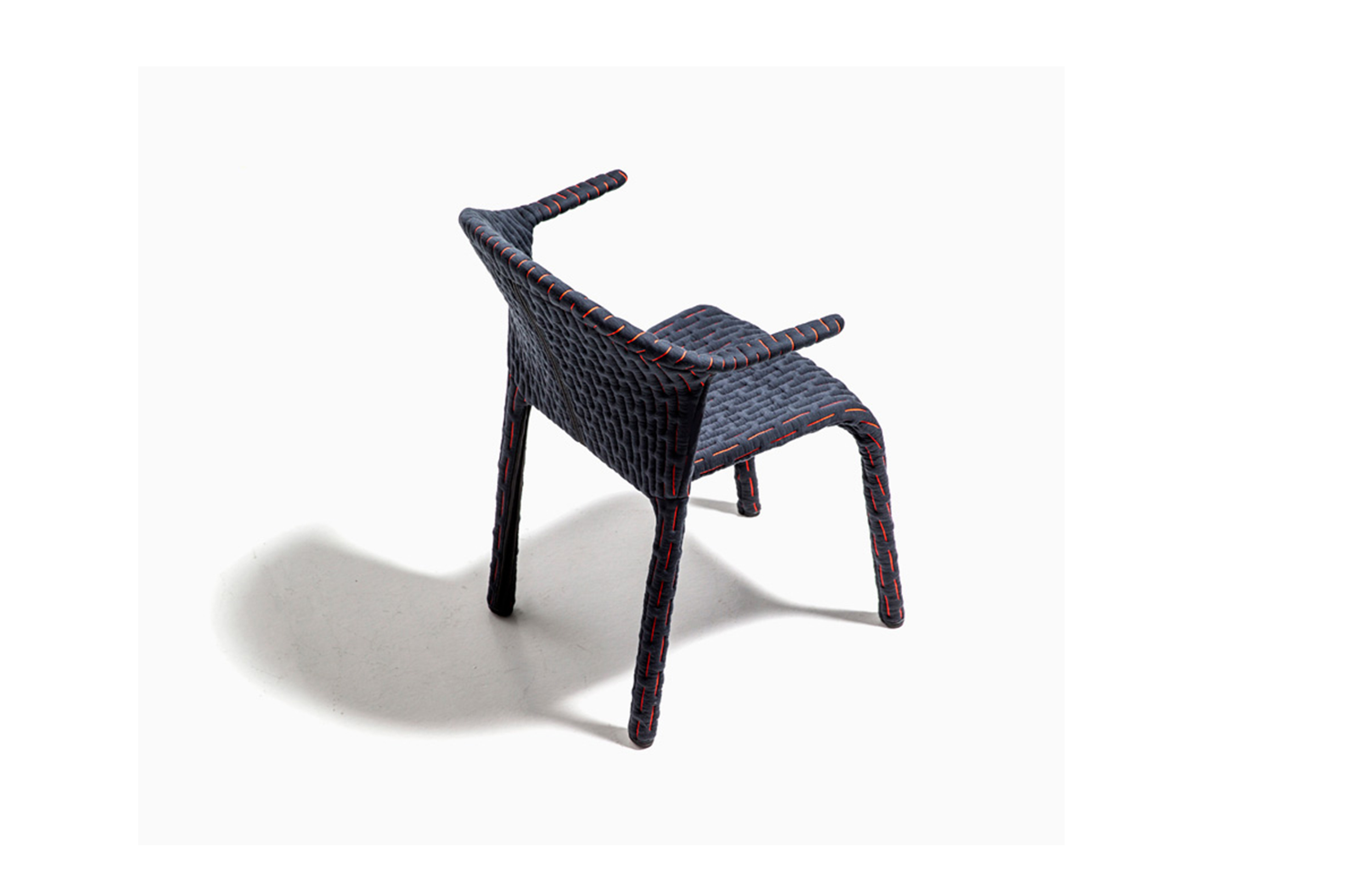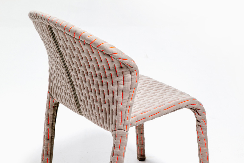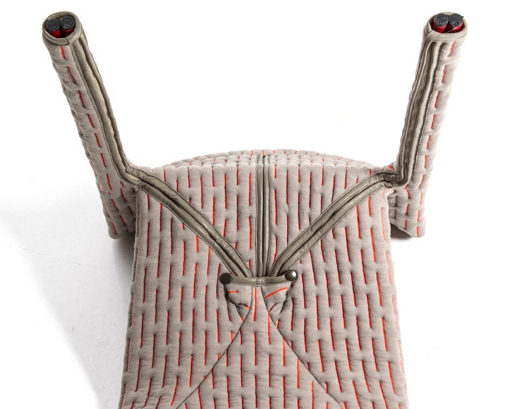 伪装成休闲椅的扶手椅,用他们的外表来控制空间。这主意很简单,用一件有衬垫的大衣盖住金属框架然后把它变成别的东西。一种非常直立的姿势,扶手的形状让人联想到双排扣外套的翻领,而这种相似之处就在中央扣扣上。室内装潢变成了衣服,可以在不过度的情况下,将赤裸的身体转变成一种追求自身内在同一性的物体。