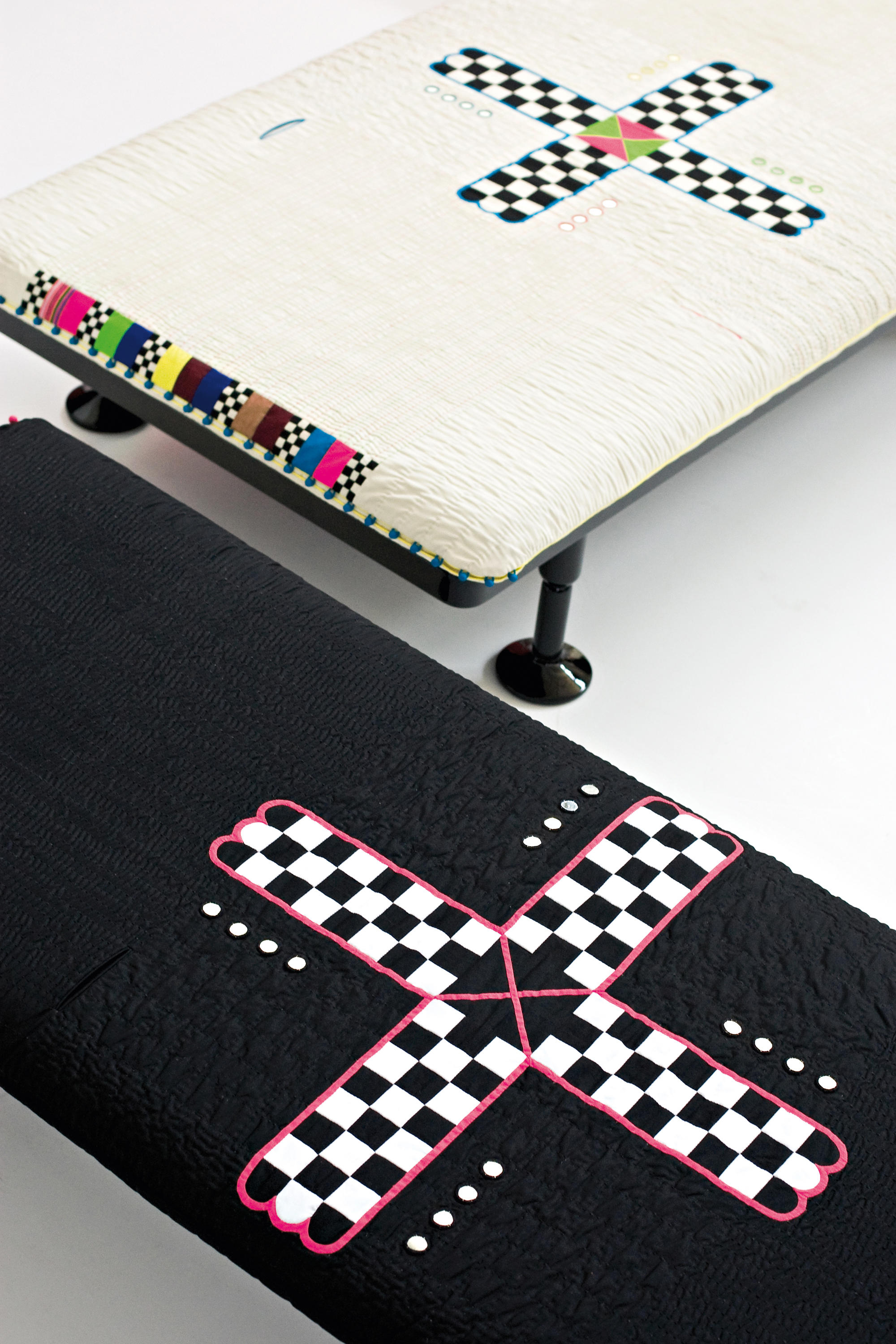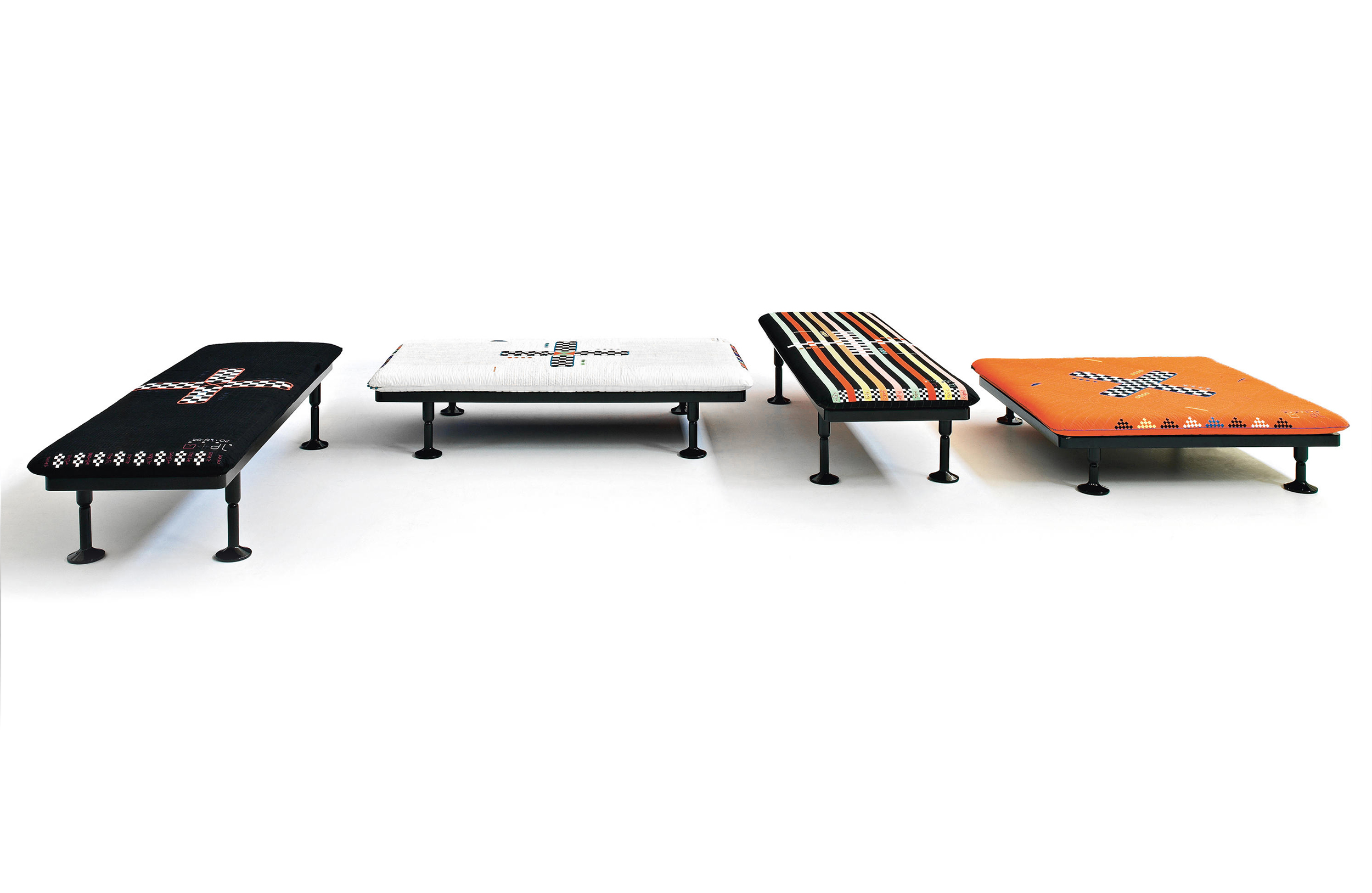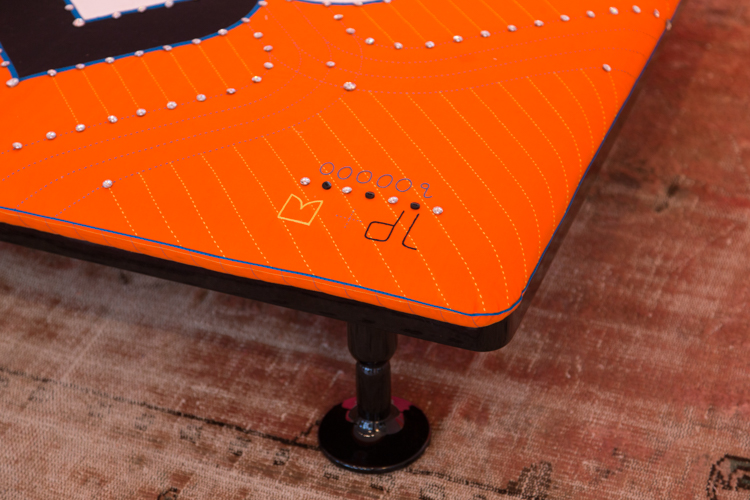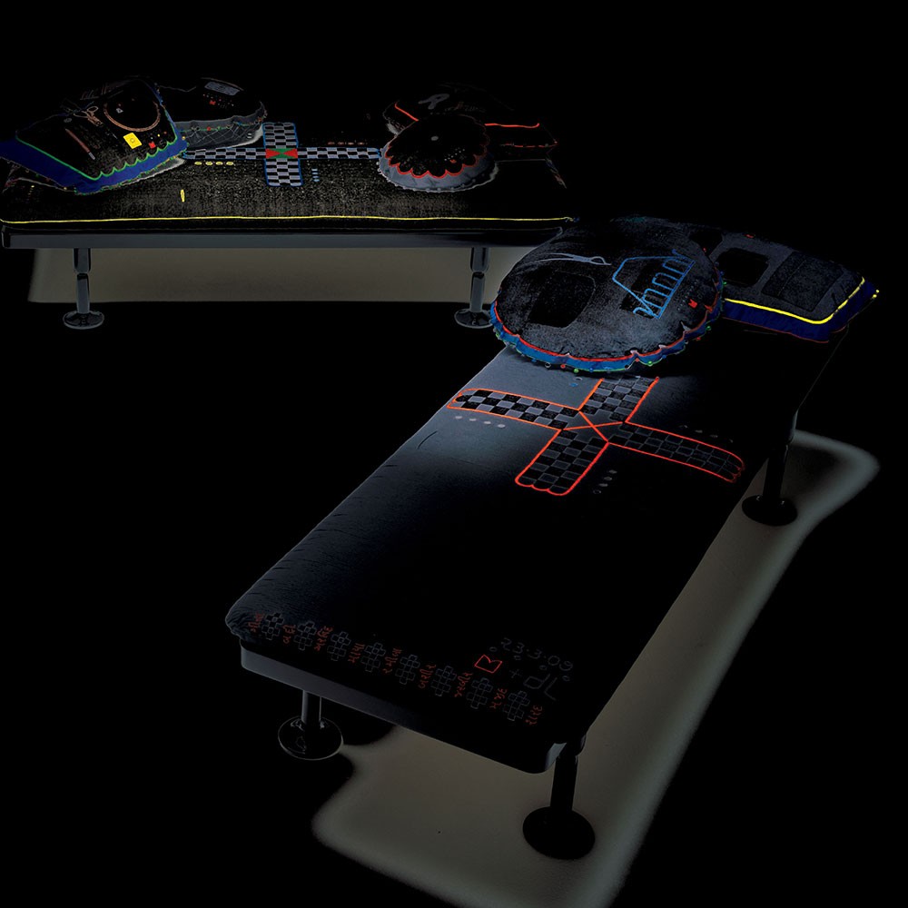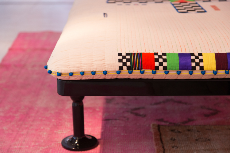 Charpoy,意思是“四条腿”,是对印度大床的反思。Charpoy有一个手工制作的棉花和丝绸床垫装饰由宝贵的手工刺绣。这种装饰是一种游戏的摹本,类似于草稿,在印度,这让人想起了战争时期,王国和妻子被作为赌注赢了。印度轻便床是一种极具价值的物品,它浓缩了手工处理的传统、工艺技巧和丰富程度,与意大利工业生产的黑色漆面与底层木基形成了鲜明的对比。