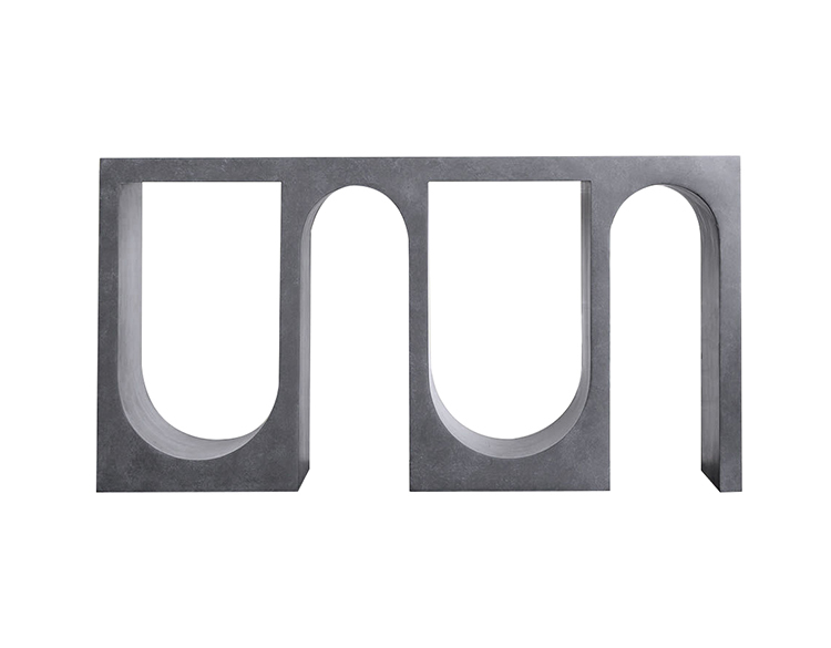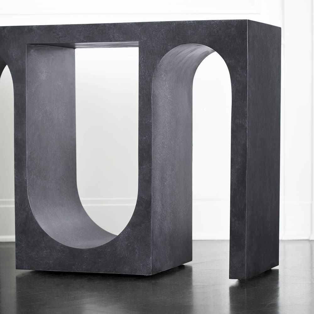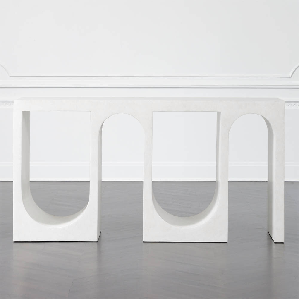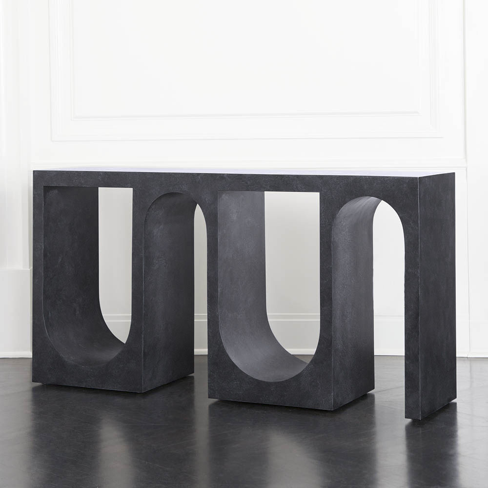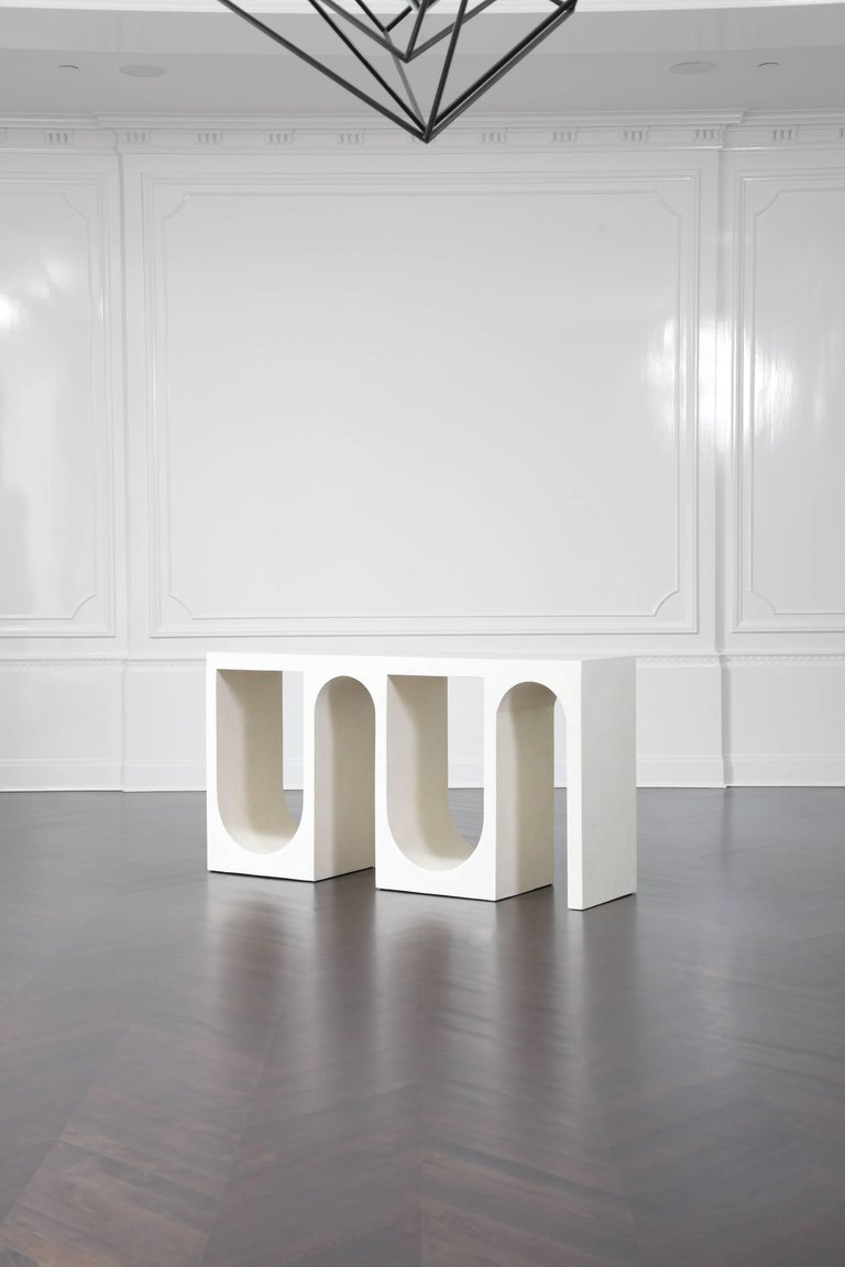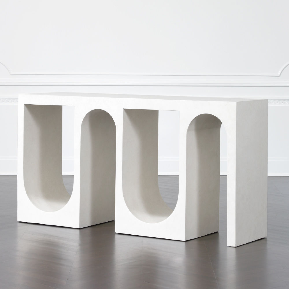 Roxbury玄关台采用实心树脂铸造,手工抹平石膏饰面,具有图形轮廓。 交替的拱形形成了这个独特的玄关台的形状,创造了空间几何和颜色的美丽调制。
