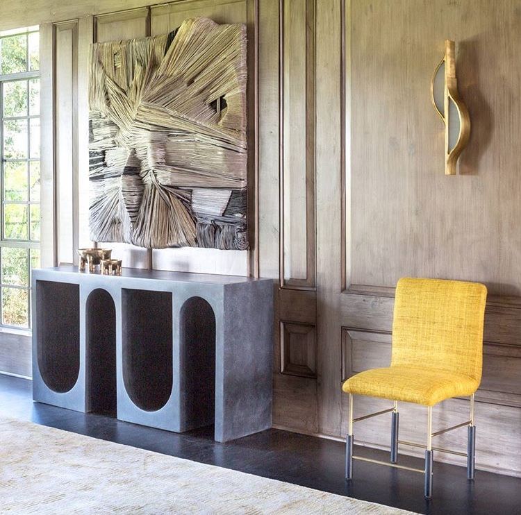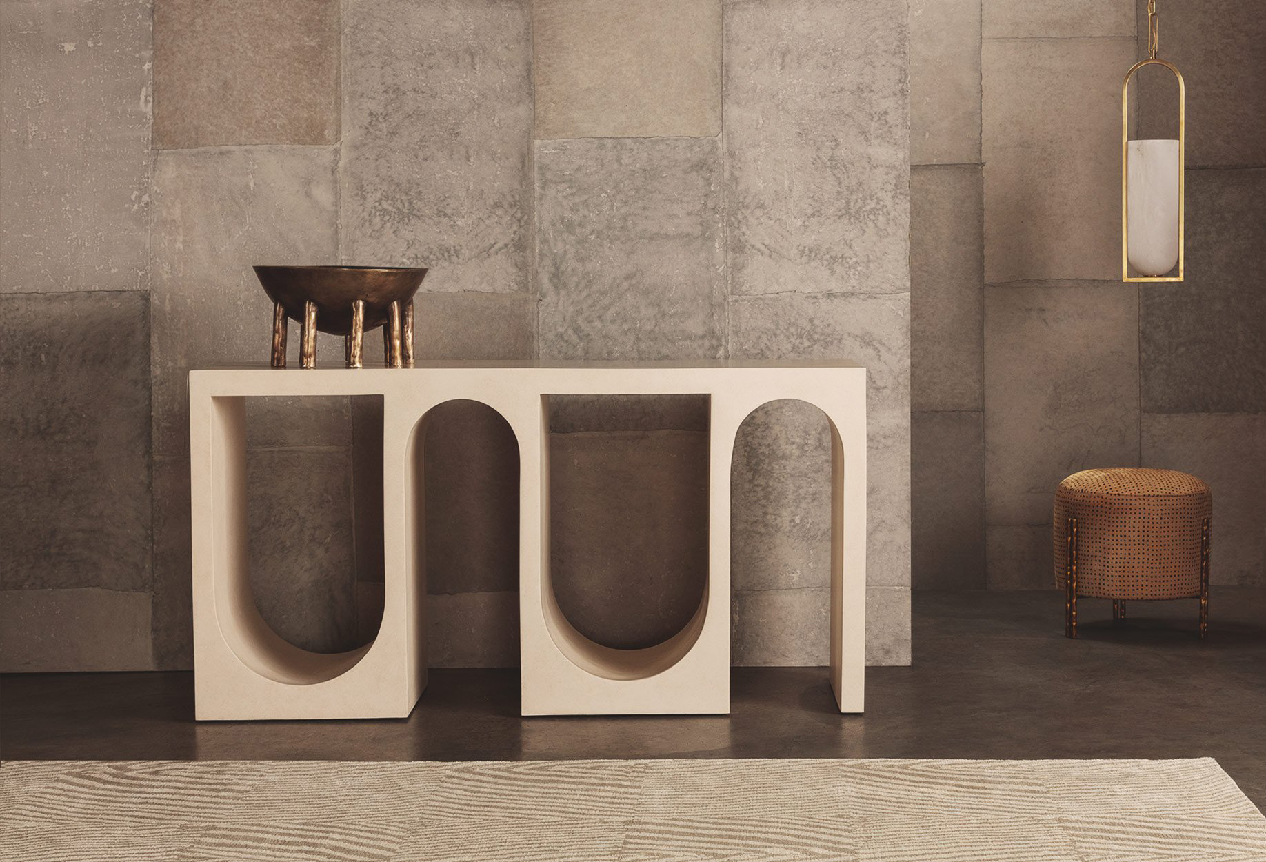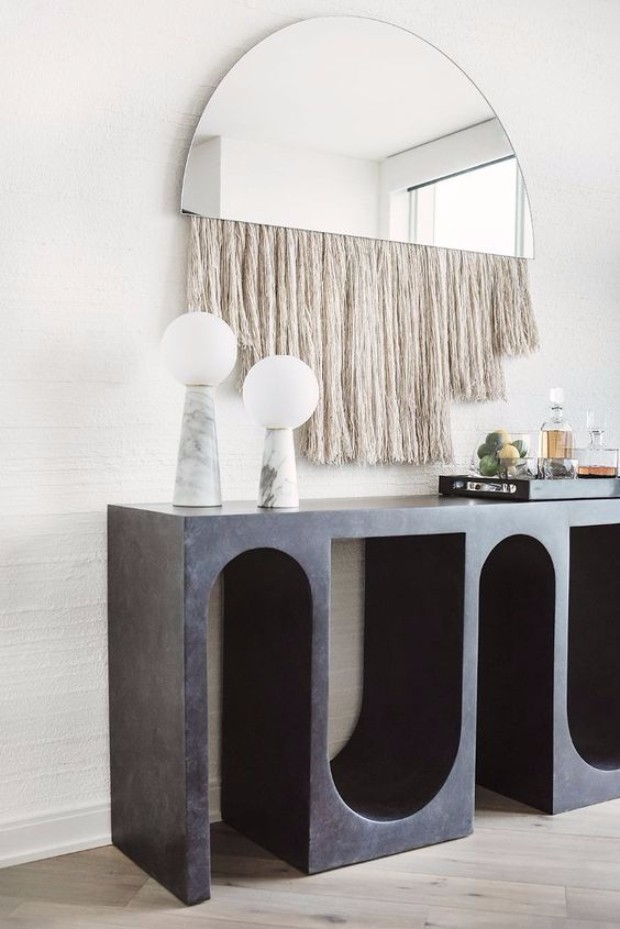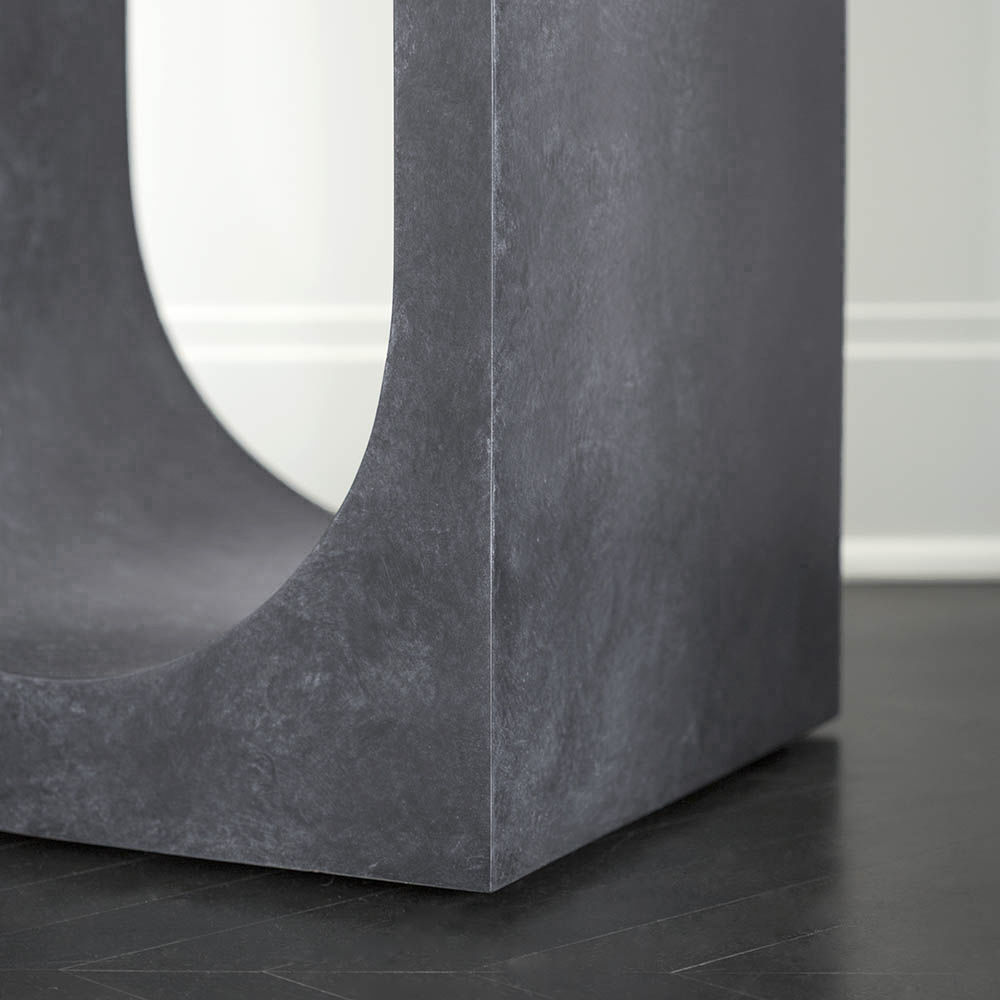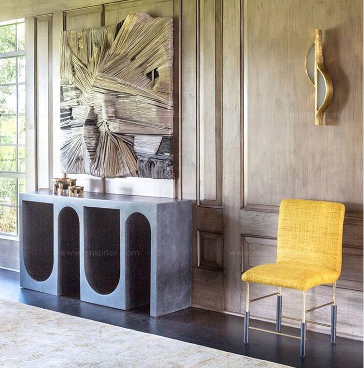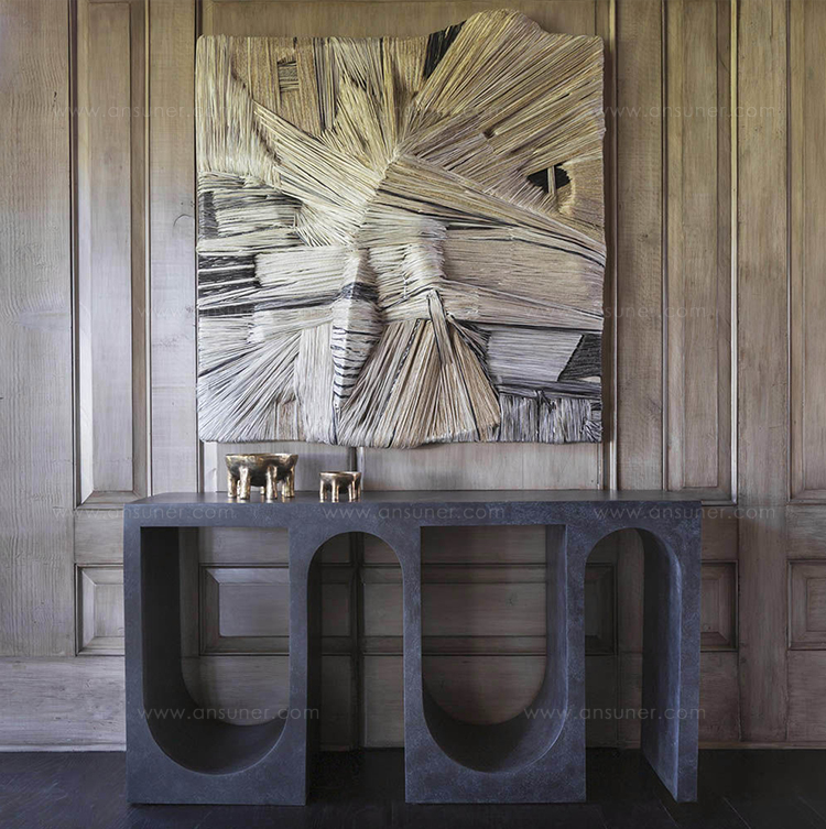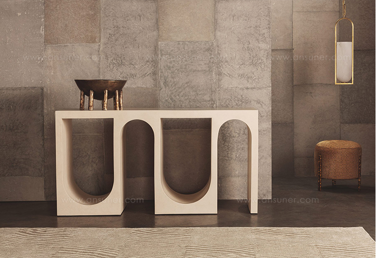 Roxbury玄关台采用实心树脂铸造,手工抹平石膏饰面,具有图形轮廓。 交替的拱形形成了这个独特的玄关台的形状,创造了空间几何和颜色的美丽调制。