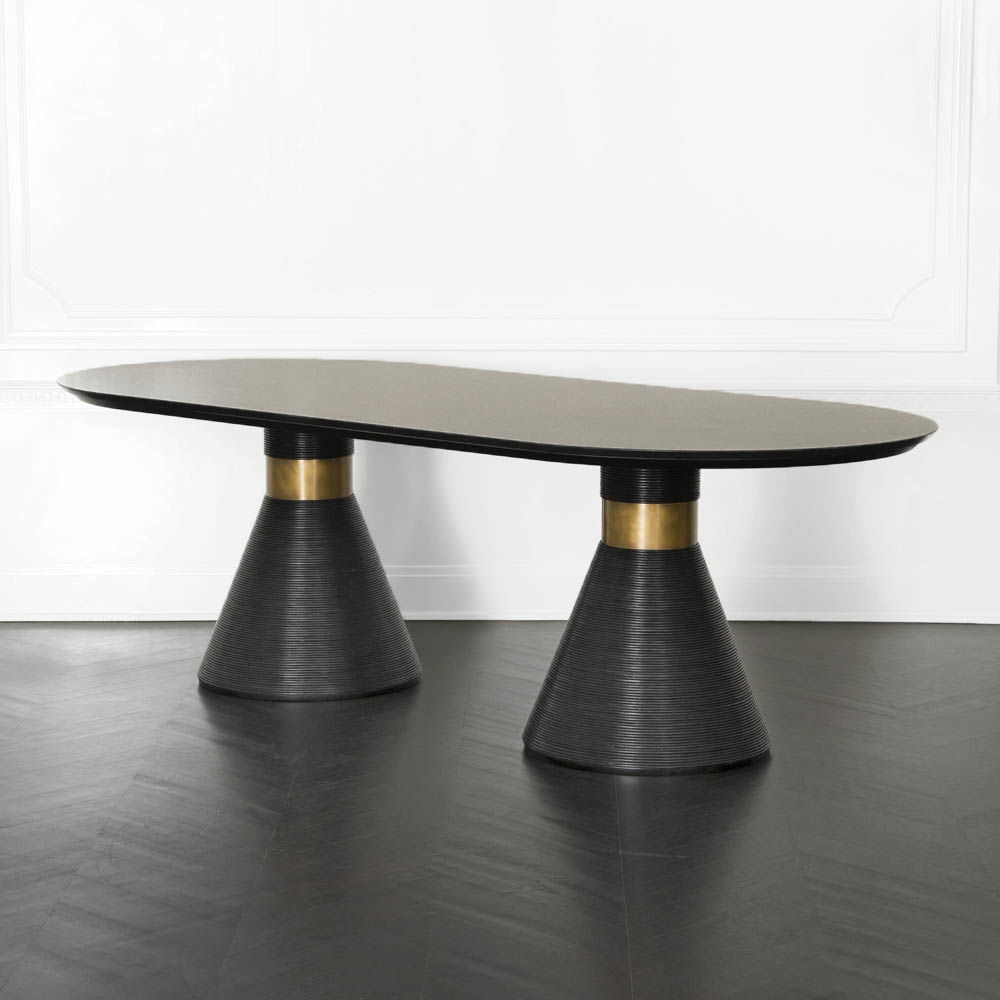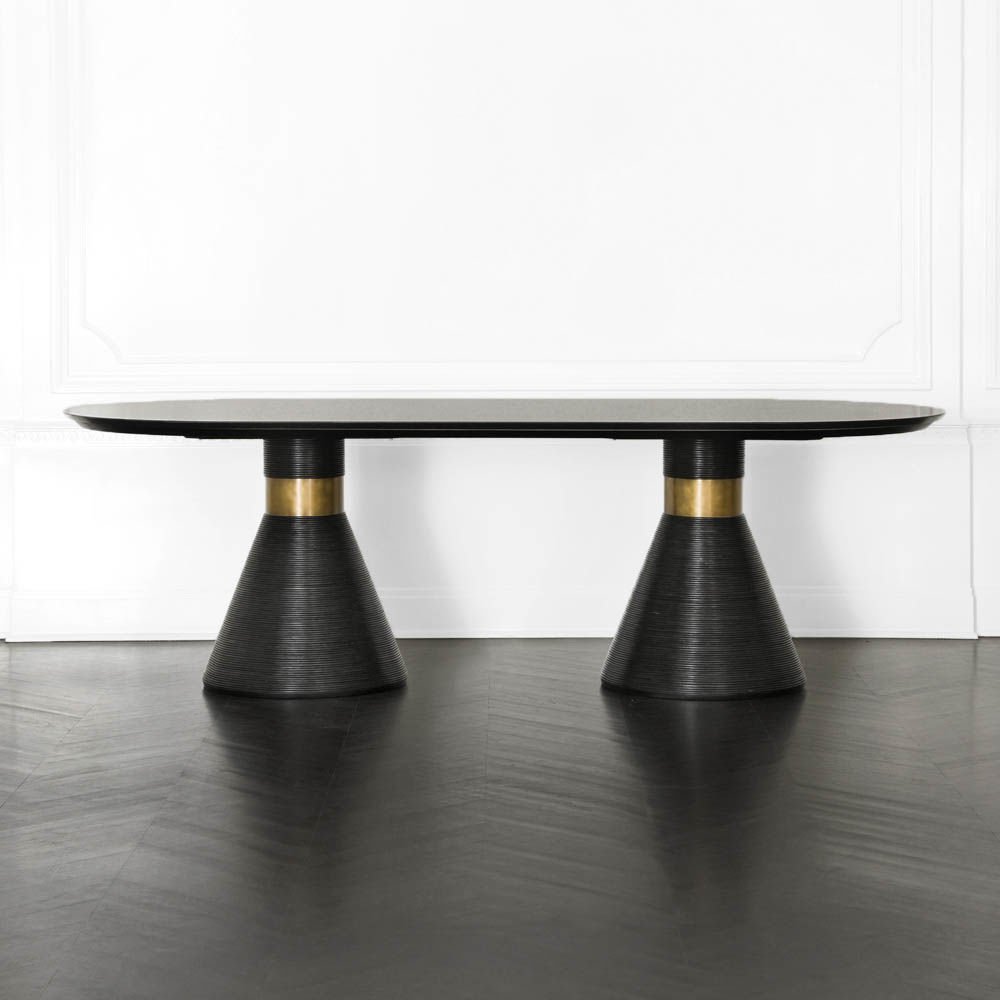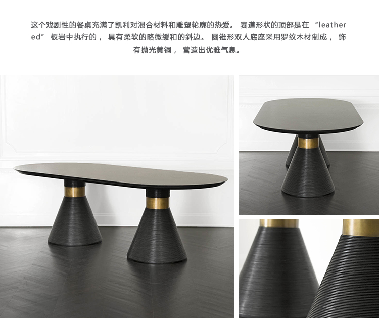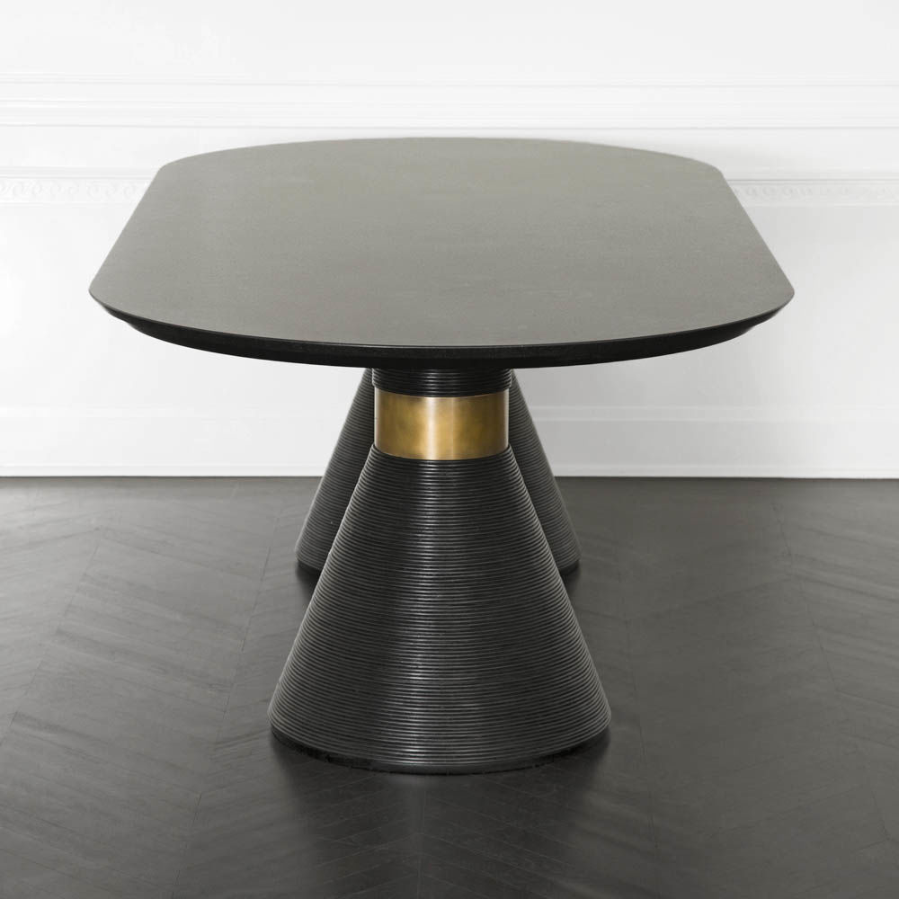 这个戏剧性的餐桌充满了凯利对混合材料和雕塑轮廓的热爱。 赛道形状的顶部是在“leathered”板岩中执行的,具有柔软的略微缓和的斜边。 圆锥形双人底座采用罗纹木材制成,饰有抛光黄铜,营造出优雅气息。
