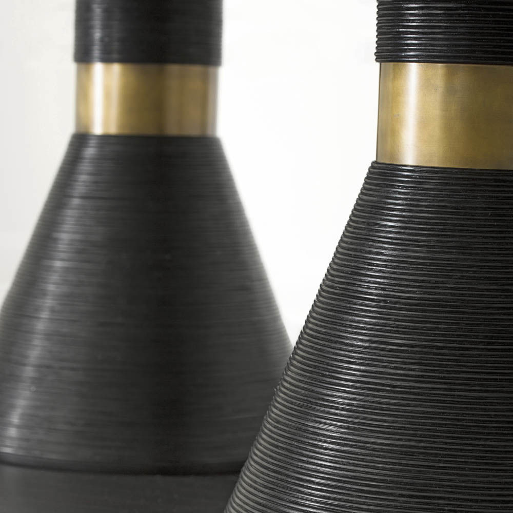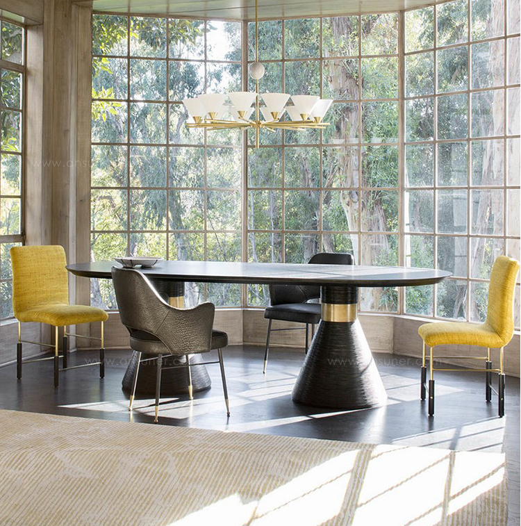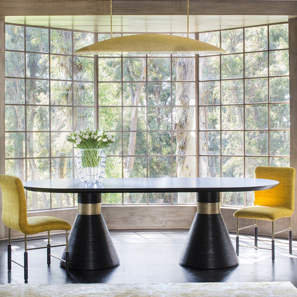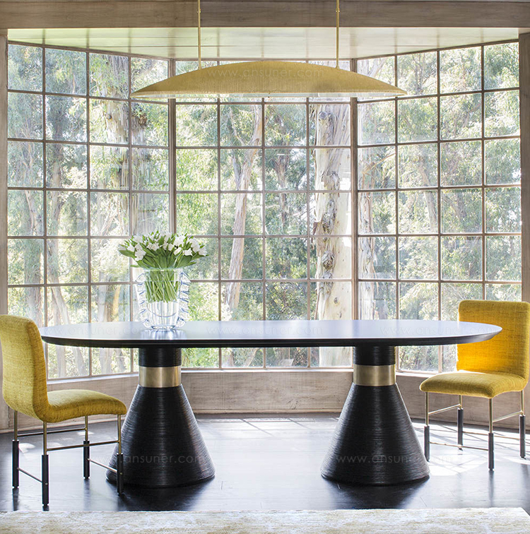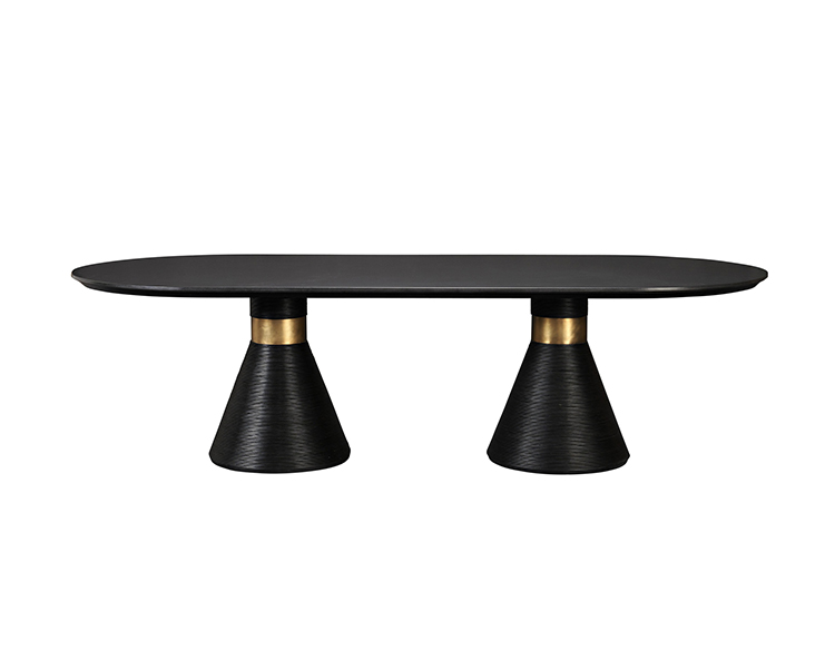 这个戏剧性的餐桌充满了凯利对混合材料和雕塑轮廓的热爱。 赛道形状的顶部是在“leathered”板岩中执行的,具有柔软的略微缓和的斜边。 圆锥形双人底座采用罗纹木材制成,饰有抛光黄铜,营造出优雅气息。