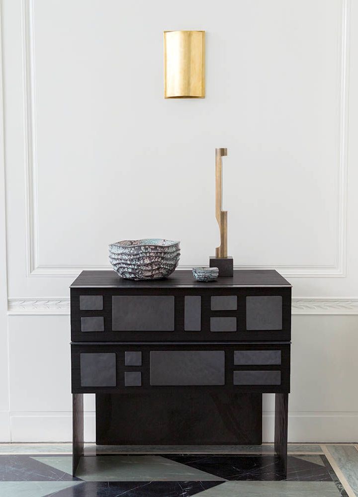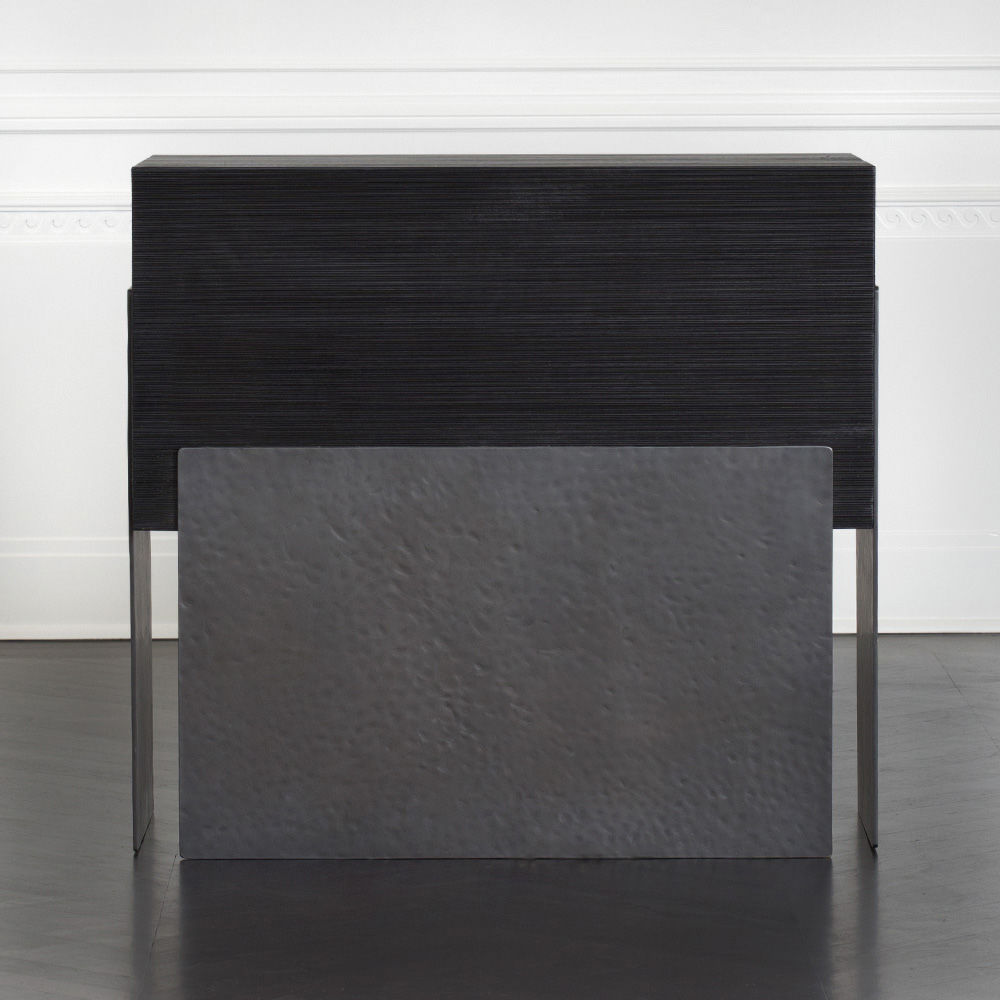细腻的罗纹与Hyperion玄关柜的深层乌木饰面相结合,赋予这款柜子醒目的轮廓。 每块铸造黄铜都有手工锤打纹理和光泽的黑色饰面。 两个深抽屉在软关闭硬件上滑出。 这款柜子可以很容易地作为床头柜或配置在一个戏剧性的入口通道。
