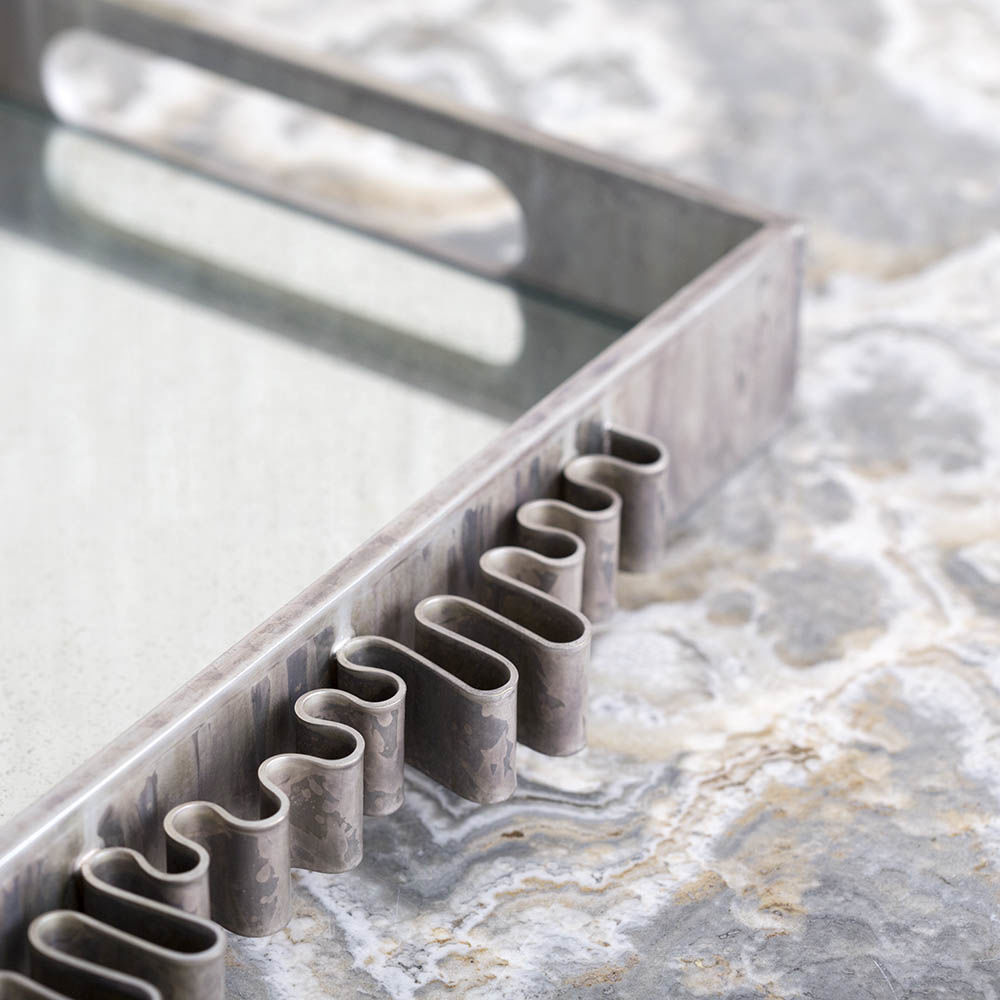 Avant托盘在洛杉矶工作室手工制作,优雅地衬有古董镜子。 托盘采用酸洗方式,具有独特的银色光泽,产生真正独特的作品。