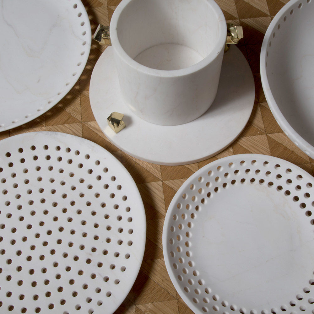 这只优雅精致的展示碗借鉴了凯利对对称的热爱,采用了她标志性的穿孔图案。由纯白的卡拉卡塔大理石组成,它使任何空间都显得别致。