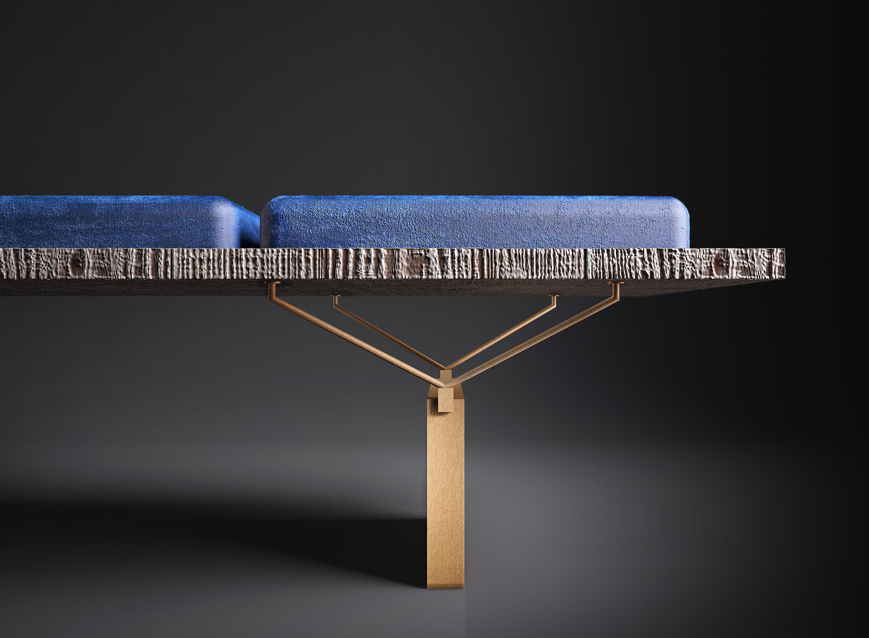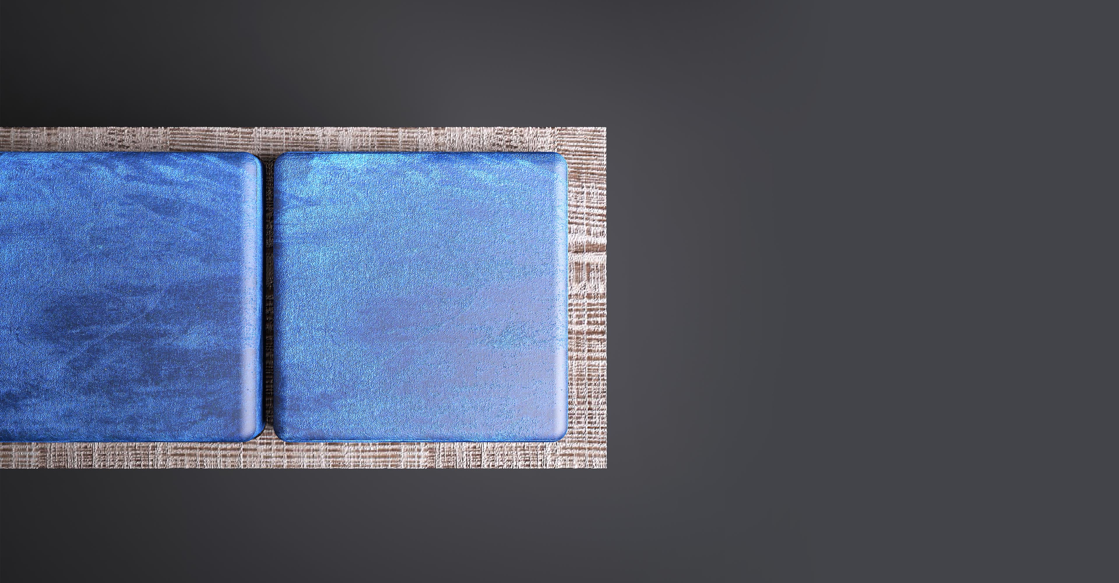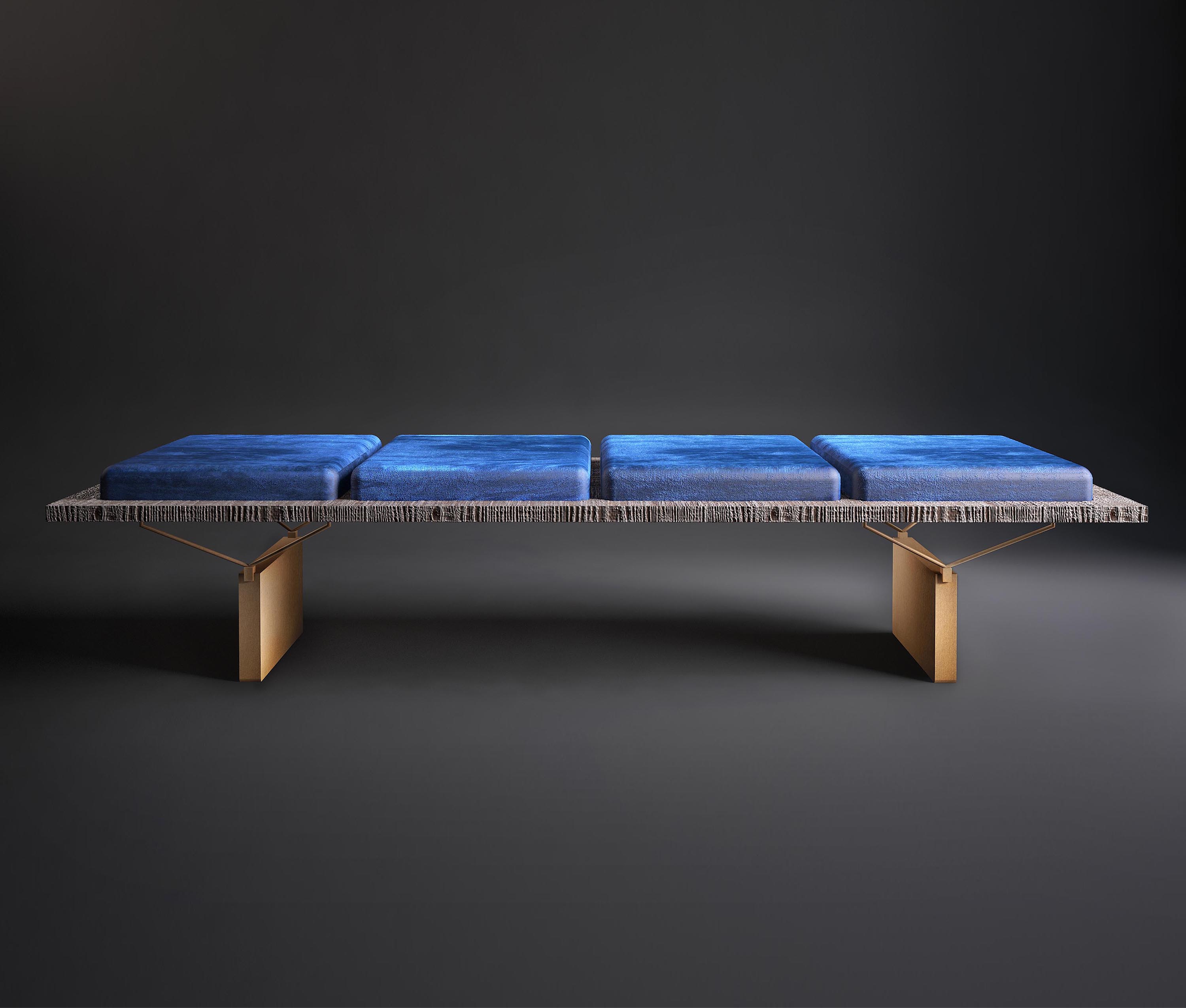 一个“没有多余装饰”的长椅,但却无法实现:通过在绒面革的柔软度和厚厚的蓝色垫子之间展现色彩,Stamford使原木座椅高贵。 薄的关节支撑着座椅,而抛光的金属腿为家具增添了优雅和轻盈。