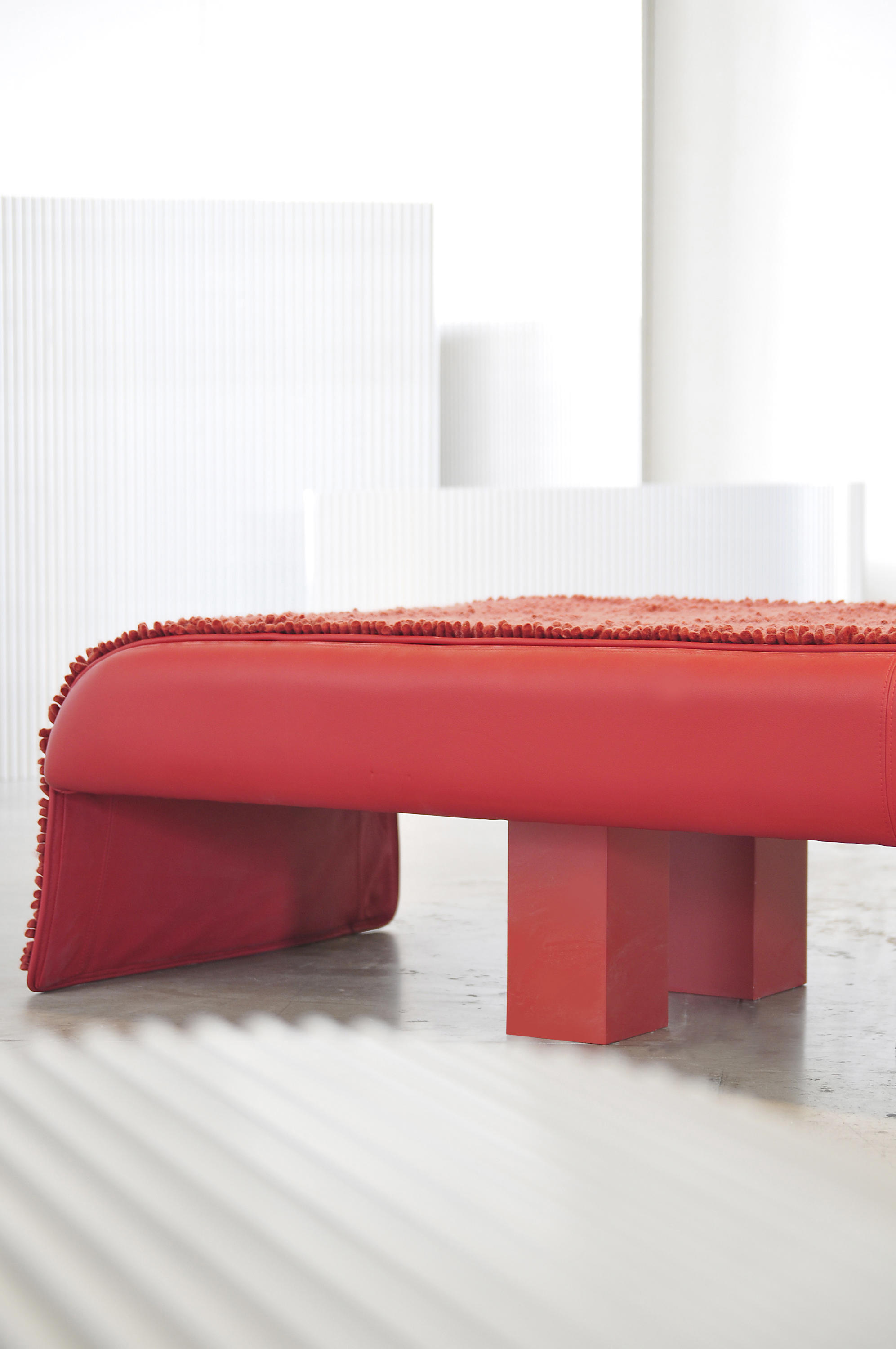 奇特的红色Tappeto Volante长椅采用哑光漆实木结构,膨胀的高容量和变密度聚氨酯填充红色皮革覆盖和上垫覆盖在可拆卸的羊毛内衬。