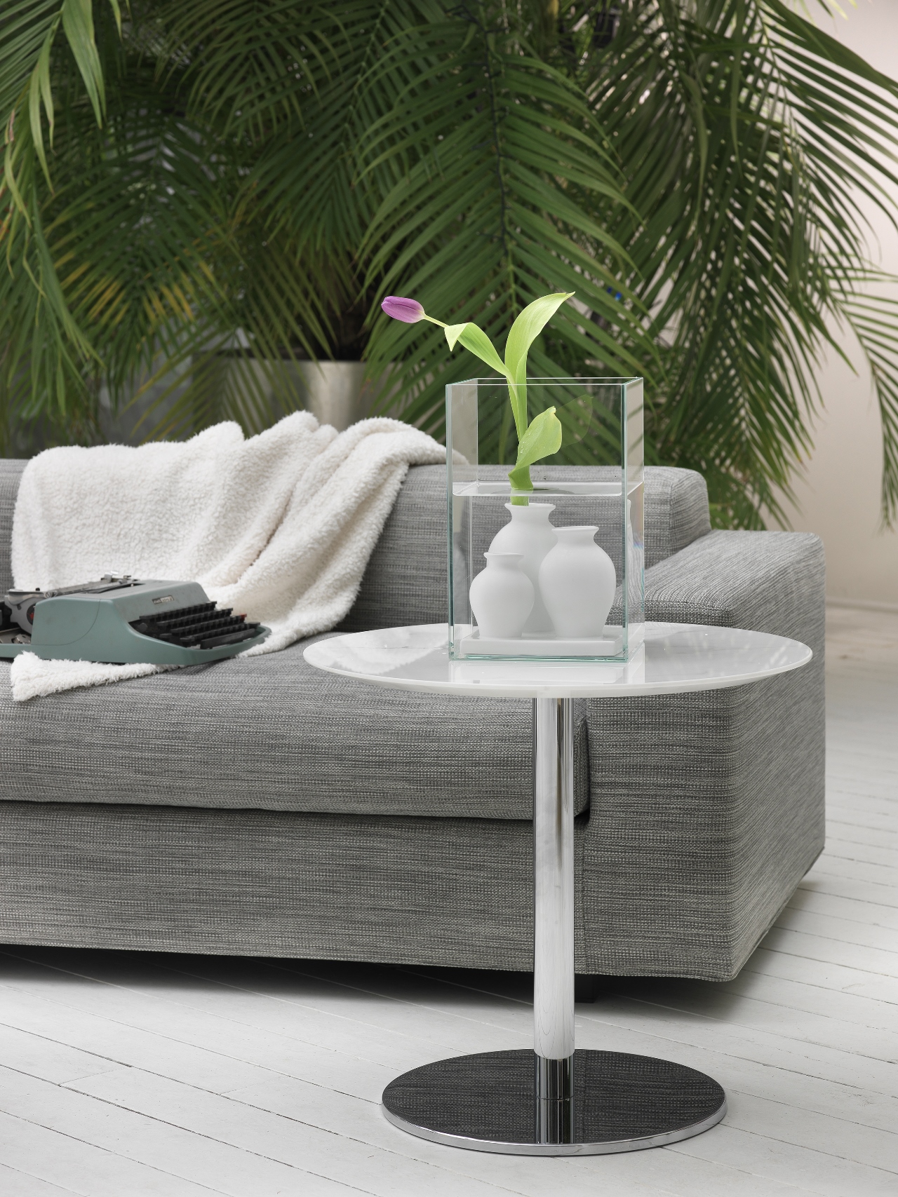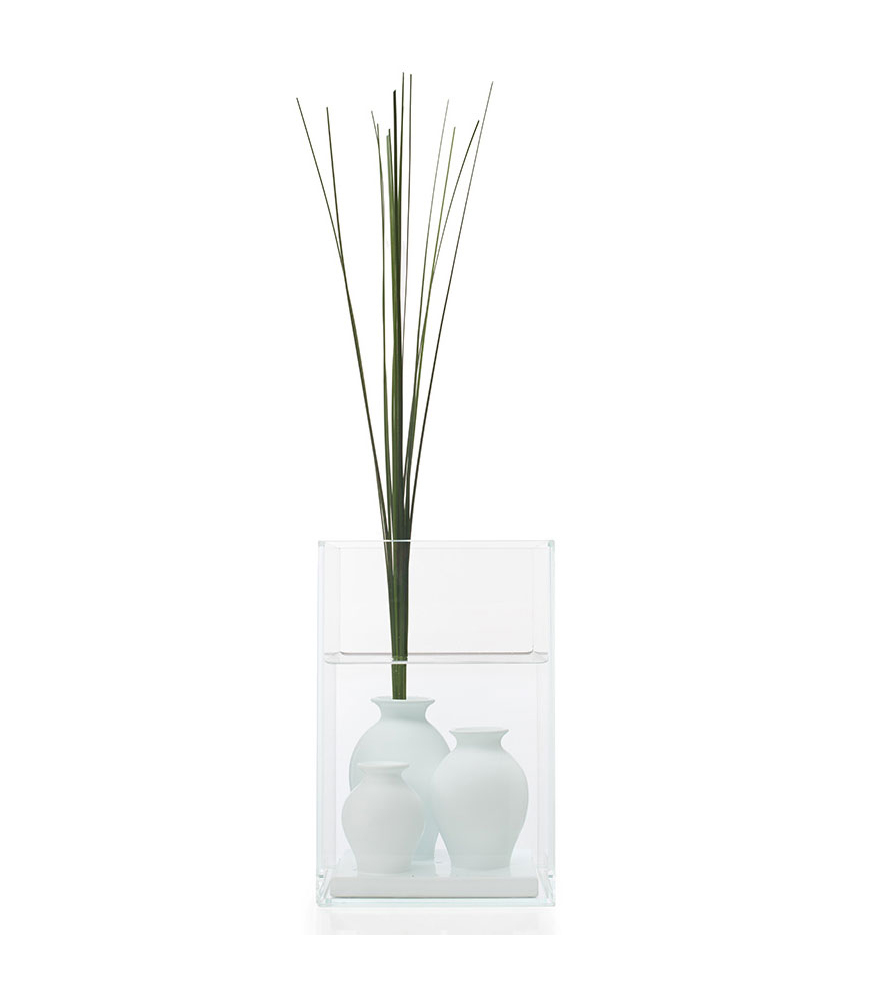亚特兰蒂斯花瓶由一个玻璃盒组成,三个小的闪亮的白色釉面陶瓷花瓶浸没在其中:通过在花瓶中放置切花,创造了迷人的水生气氛,花朵在表面上诗意地升起。