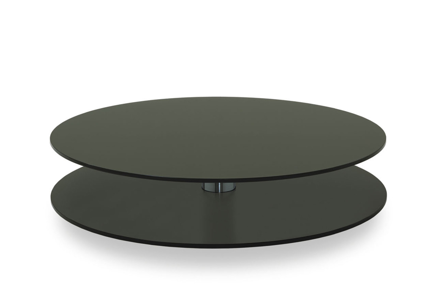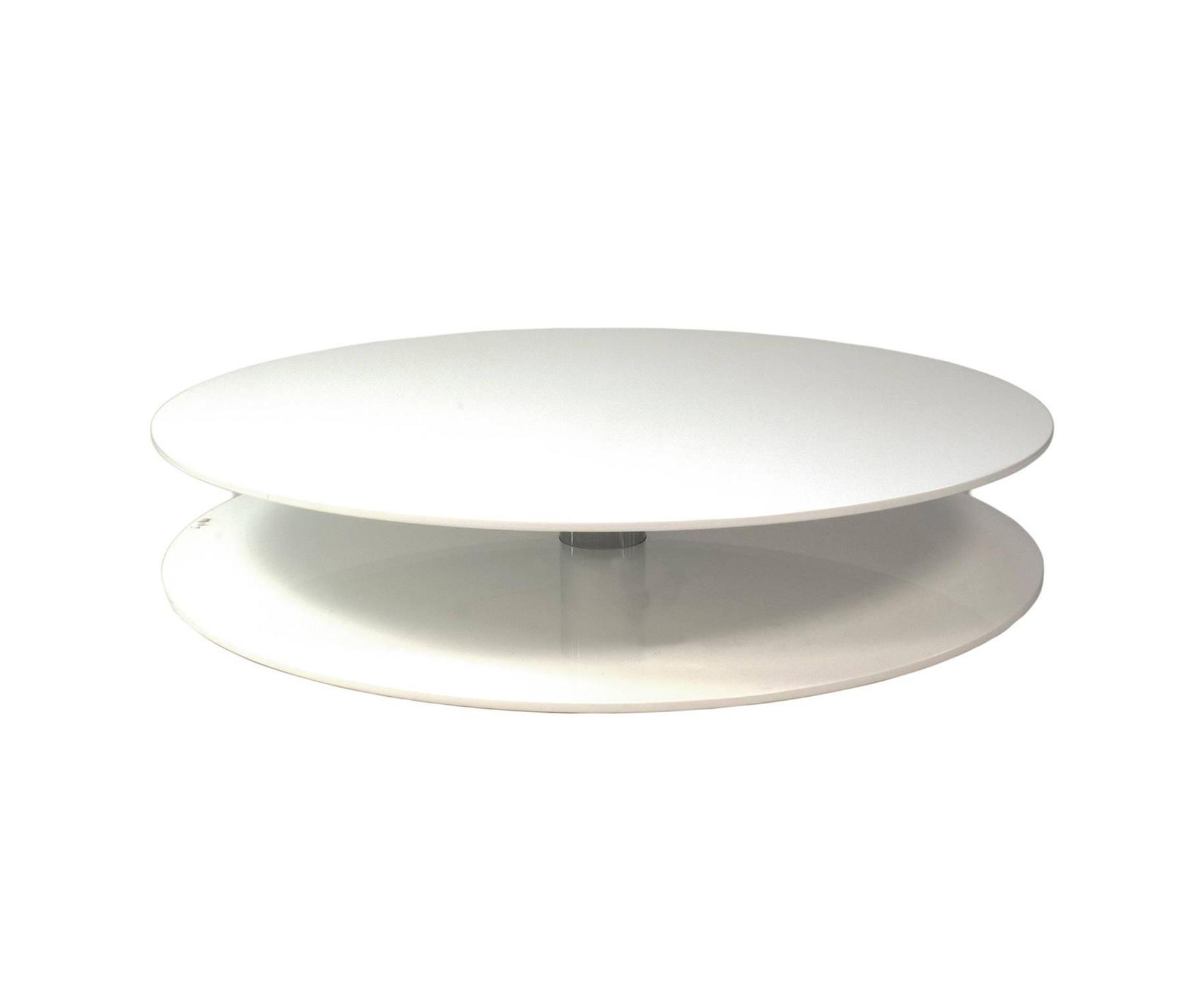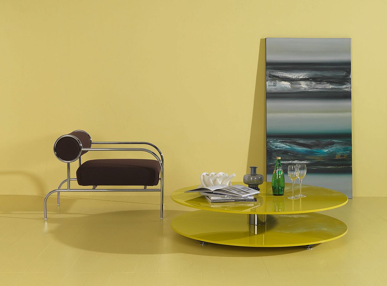 圆形咖啡桌由两个木制台面亚光或抛光漆组成,可提供所有颜色的系列,通过抛光镀铬钢柄连接。