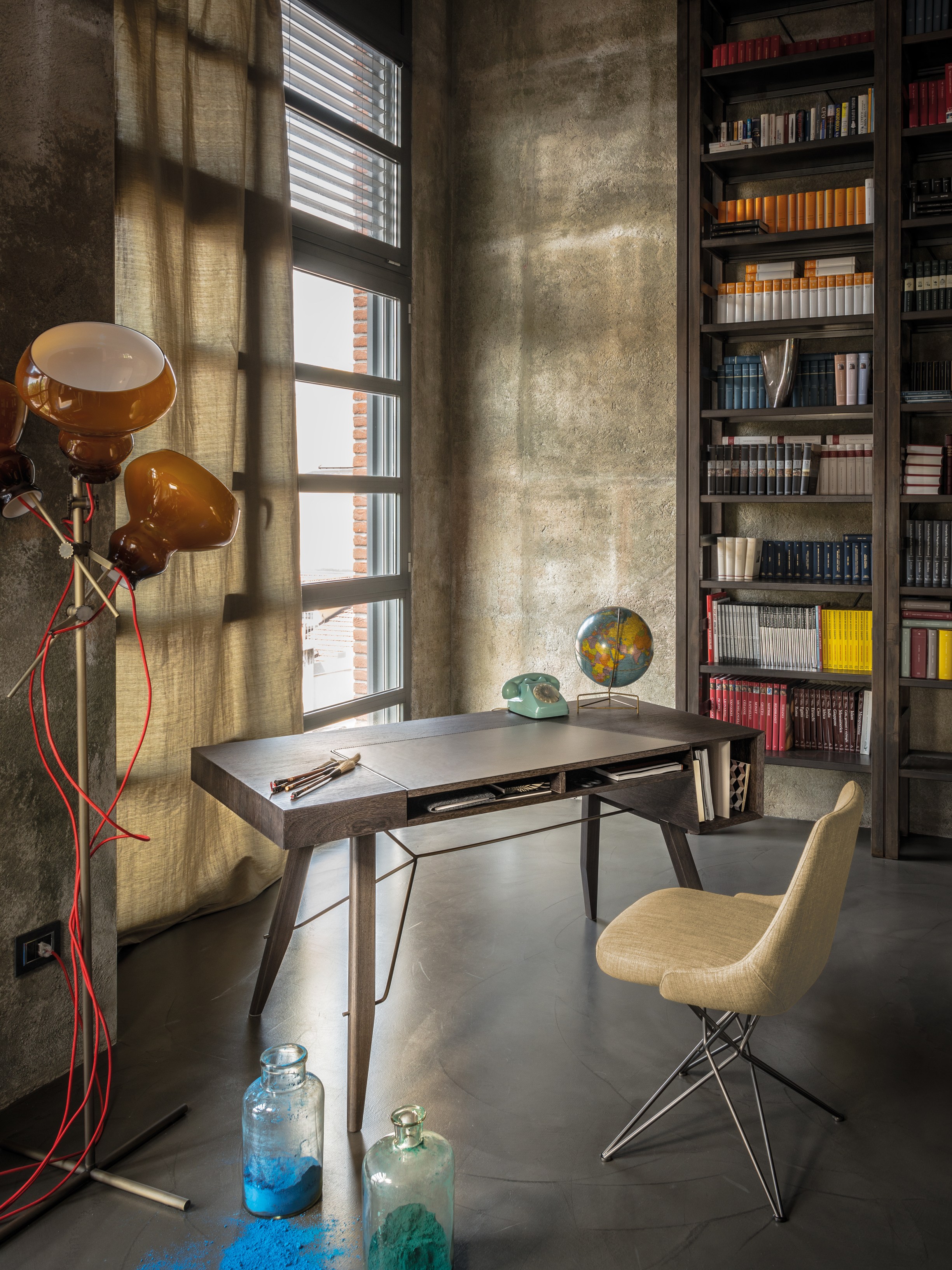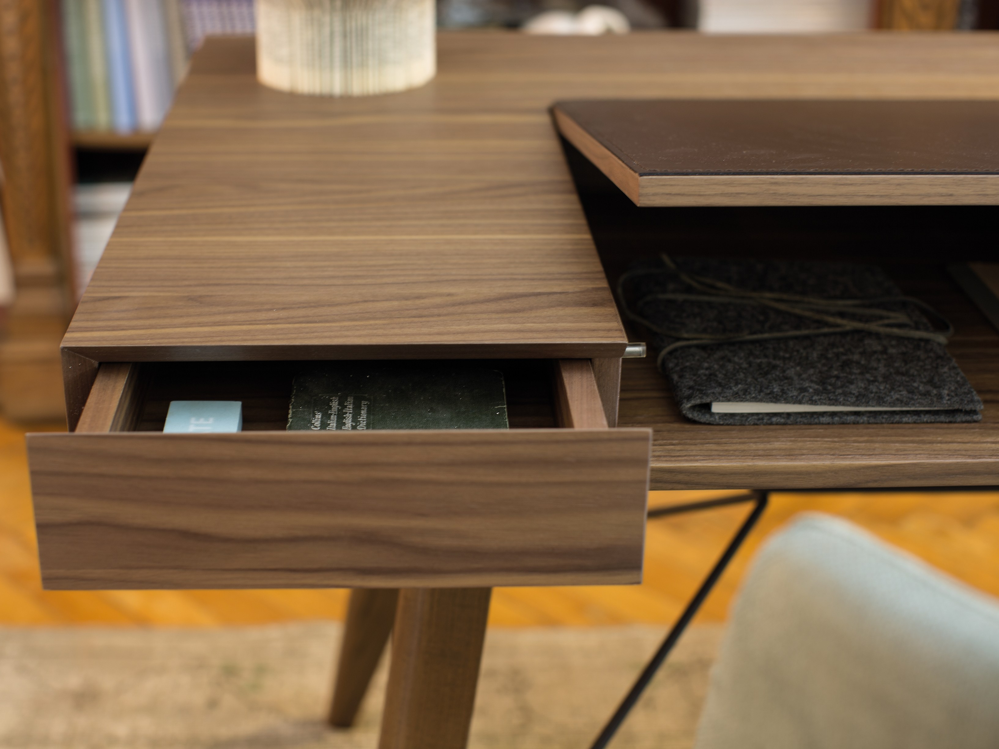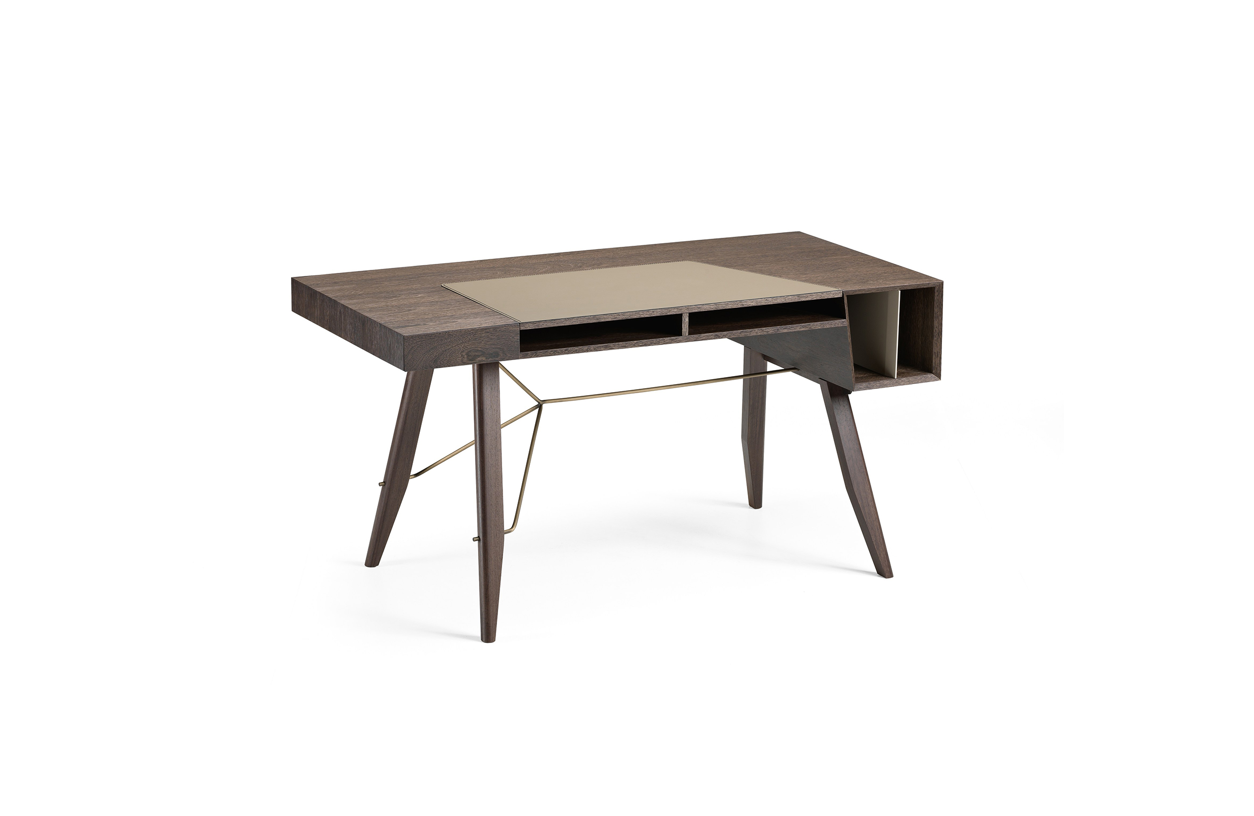 一个线性的、可适应的桌子,桌面配有皮革。这种金属镶嵌的纵横交错的底座让整个作品在纯粹的复古风格中增添了一种现代气息。抽屉的设计赋予了深度和功能,让它不仅是一个工作桌,还可以存放一些私密的文件。