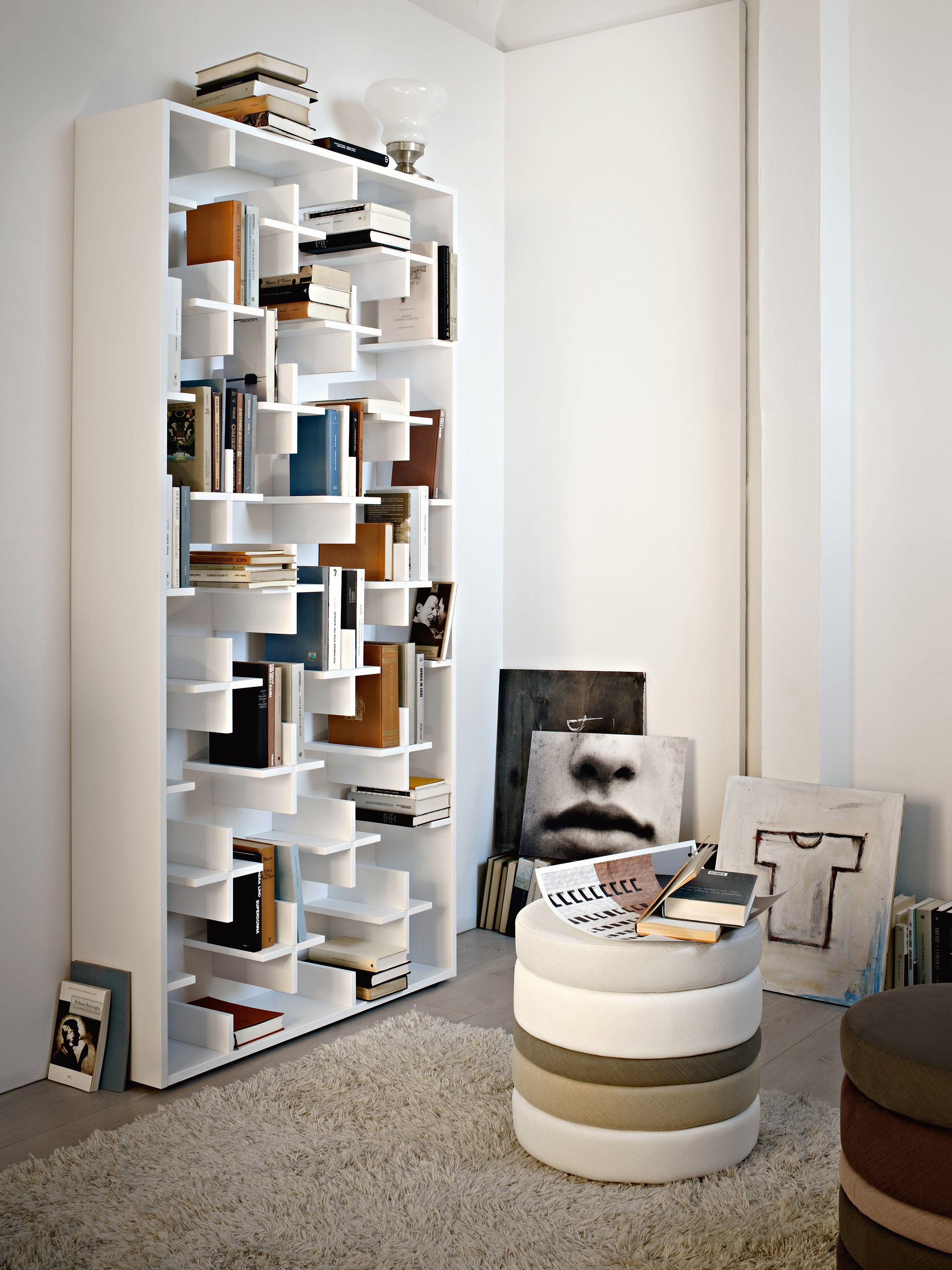 一个简单而优雅的书柜:MDF结构由很多小十字架组成,构成书的支撑。这些十字架看似杂乱无章,但当书被放置在它们上面时,它们从明显的标志变成了一个模糊而又有规律的整体。