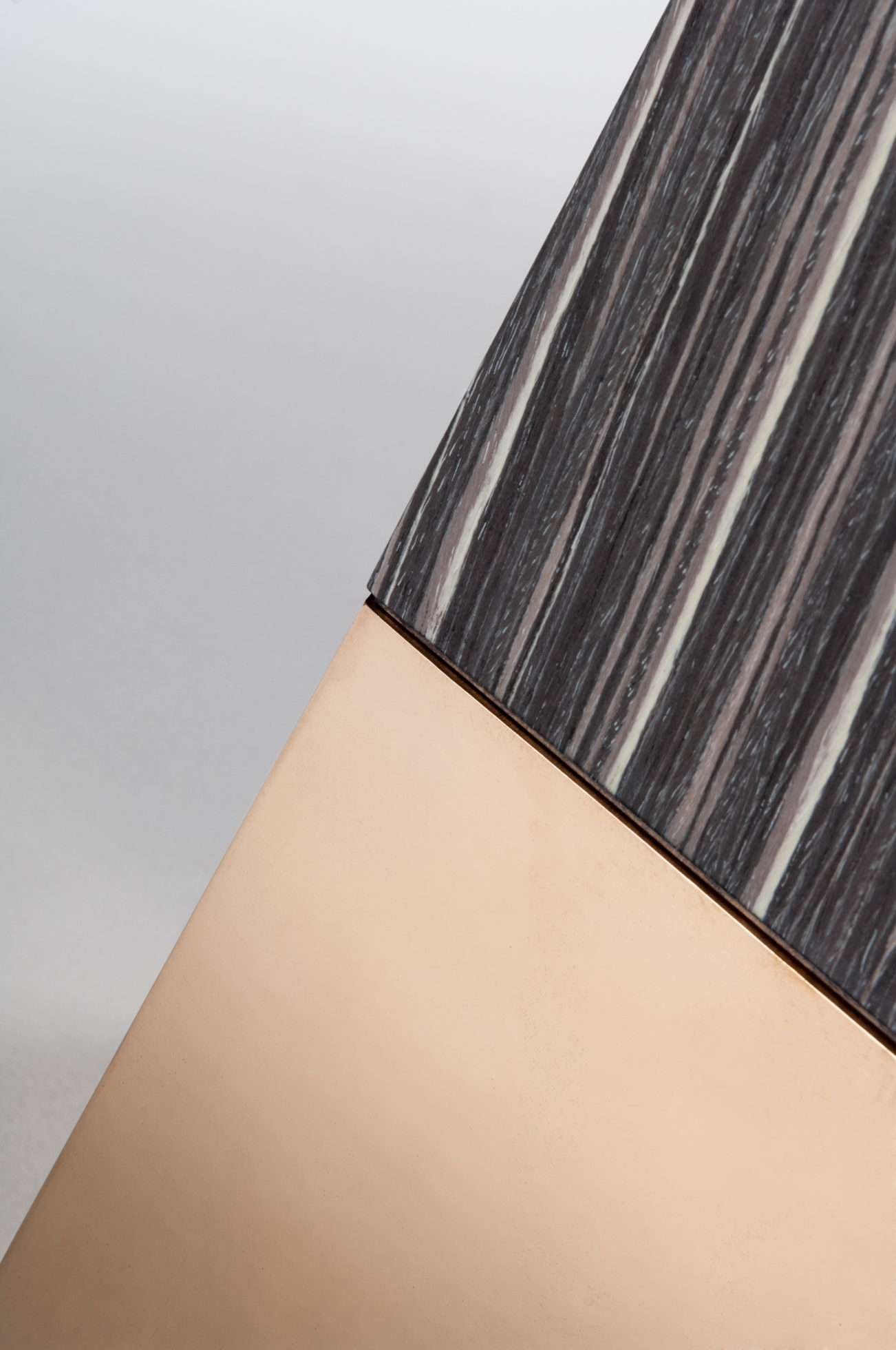 桌面有六个部分,钻石单板匹配,产生径向效果。 桌脚有一个大型铸造金属脚。