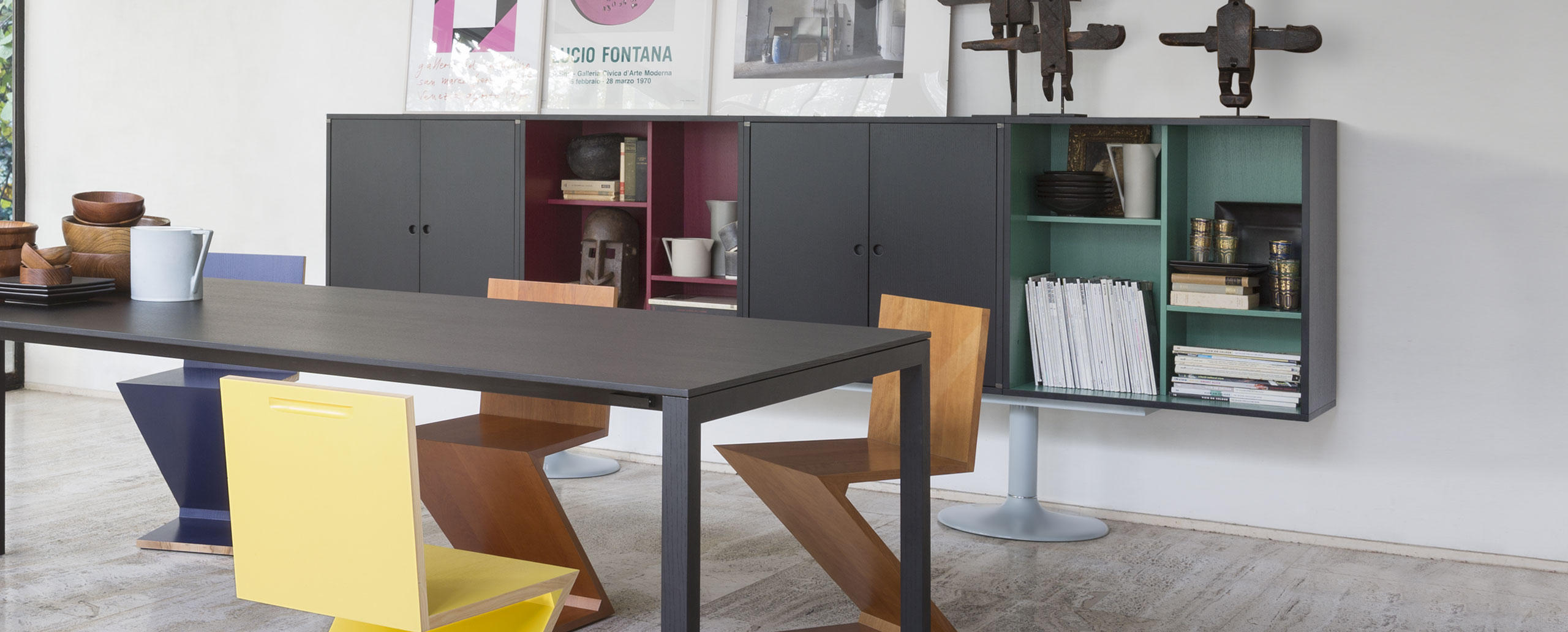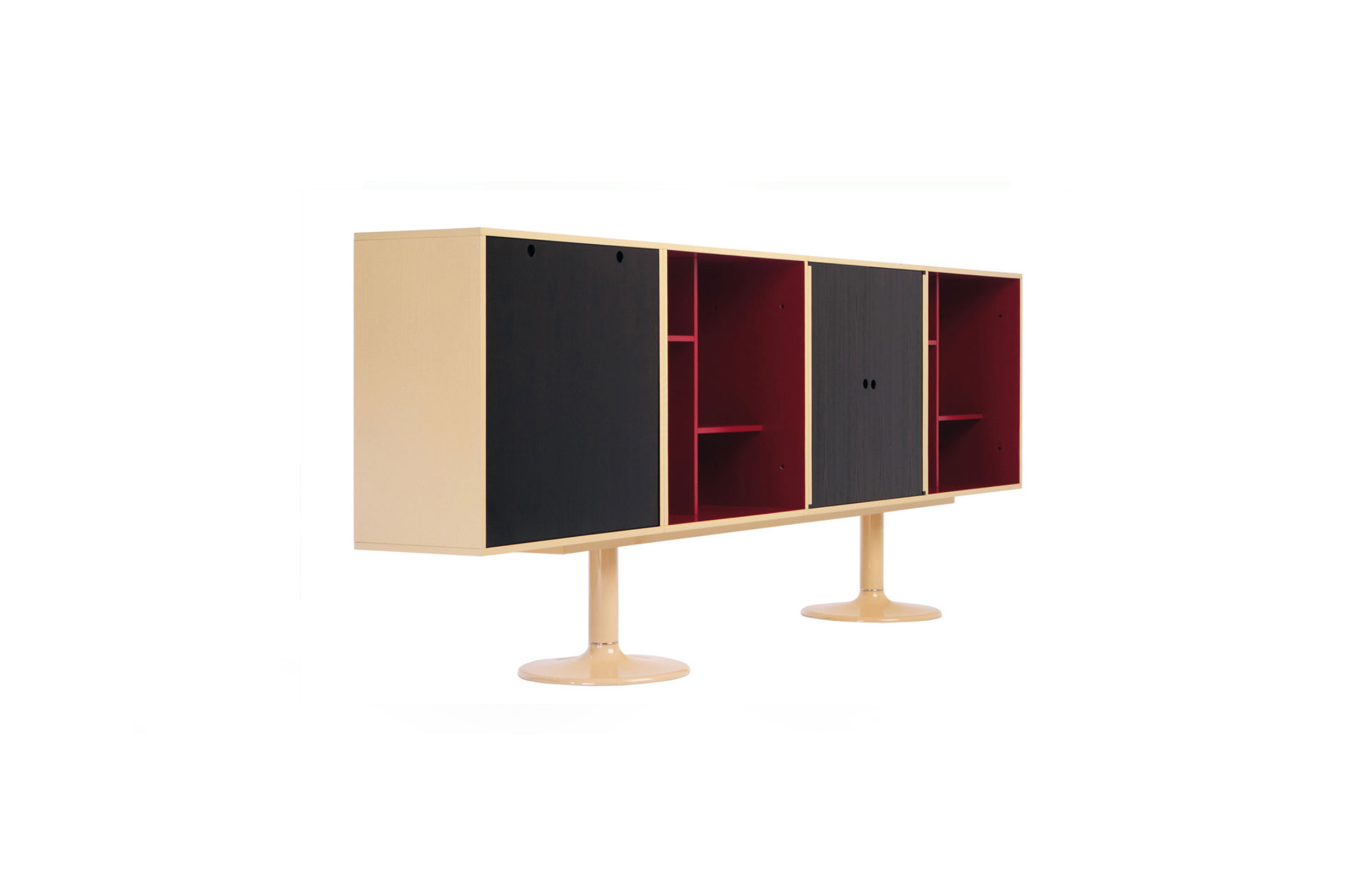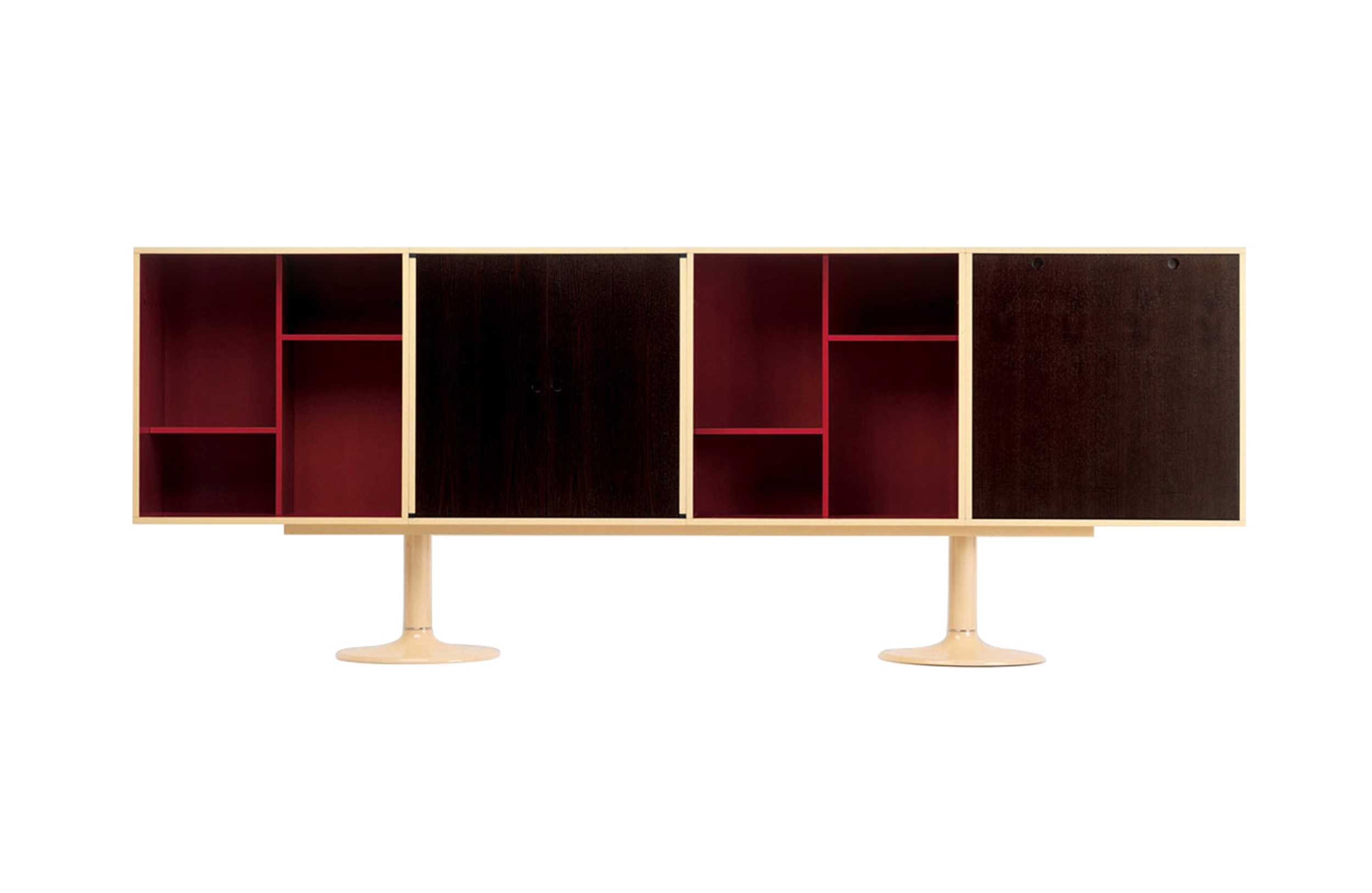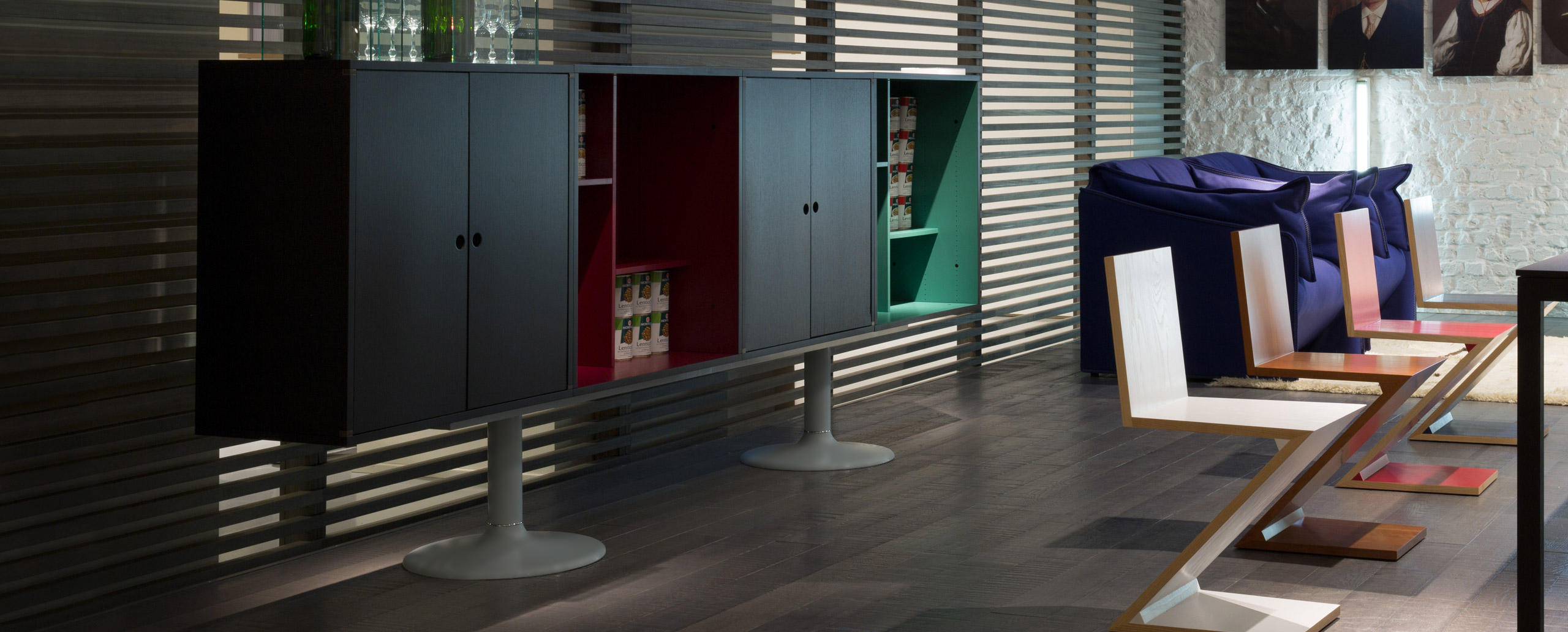 Charlotte Perriand在1984年设计的“标准柜”,由木质模块和可叠放的柜单元组成,用于满足各种要求(配备架子、抽屉等)。该款柜的基础元件是尺寸为75/75/37.5 cm的彩色中间方块。Le Corbusier和Pierre Jeanneret于1925年在巴黎“新精神展”展示了该款产品,这些柜子的设计直接源于办公室家具,除了能堆叠并连接在一起外,这款柜子还允许自由地安排空间。这款柜子由细长的底座支撑,从概念上来讲,可以比得上建筑物的容量。“标准柜”参展1929年的巴黎秋季艺术沙龙时有所改进,整体尺寸扩大,更接近真实的墙柜。