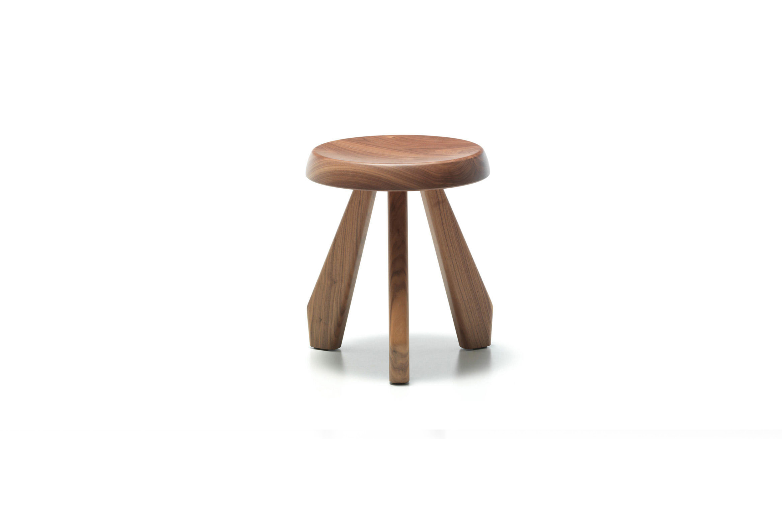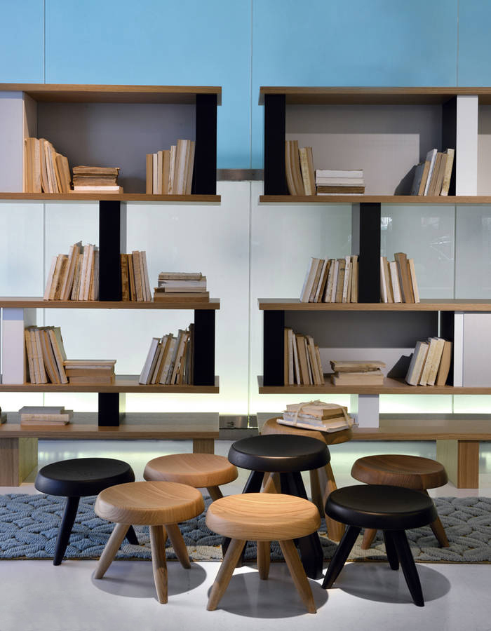 Tabouret Meribel 高脚凳,得名于Charlotte Perriand在法国美贝尔的度假屋。Perriand在这里工作和生活,多年来,她重新诠释了当地的建筑风格。这把凳子材质简单,从阿尔卑斯山的建筑风格中获得灵感。该凳采用三条“刀把型”凳腿,提供三种不同实木饰面:天然橡木、哑光黑色橡木和天然美国胡桃木。