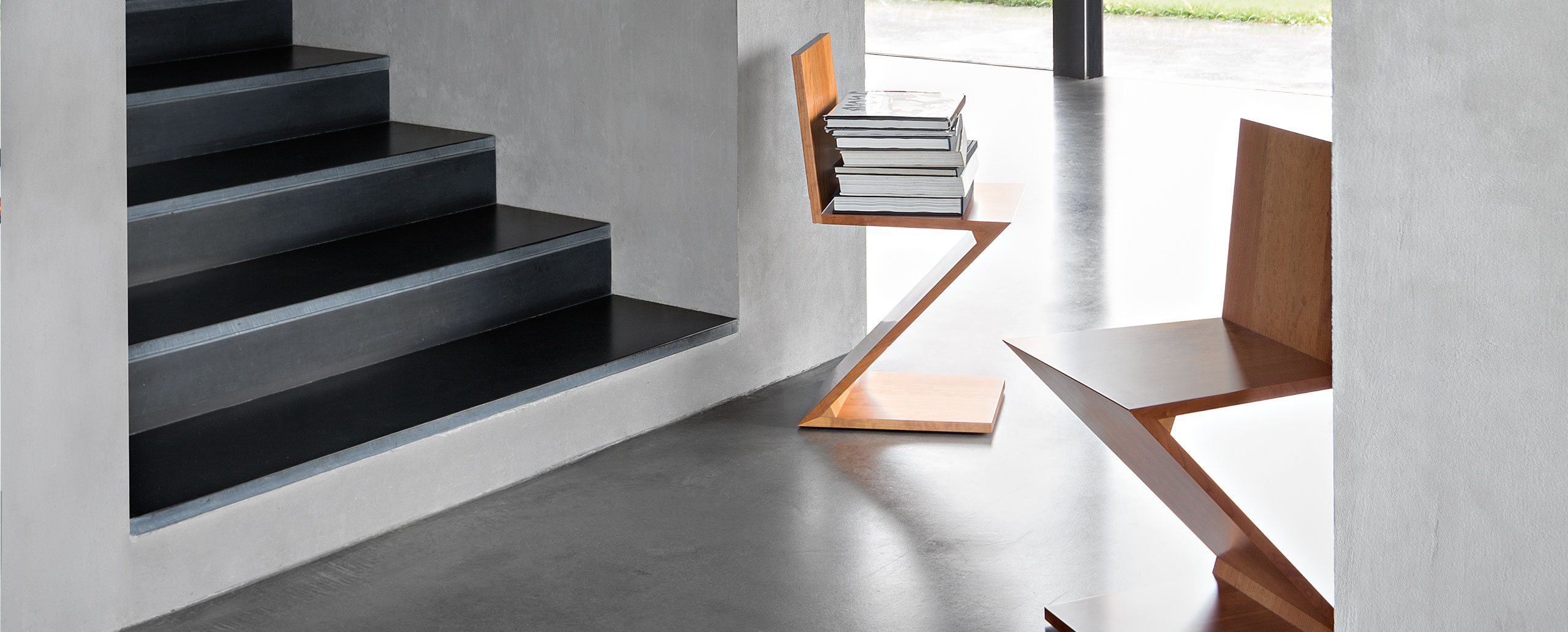 该款椅子采用天然樱桃木、天然白蜡木、或蓝色、红色、黄色、白色或黑色饰面的白蜡木制造,配有天然白蜡木边缘。靠背+座面+椅腿+椅脚。Rietveld 首次在利用新形状的场景中引入新类型椅子,归功于对角线的使用。锯齿状椅子拥有四个从顶部到底部依次优雅地弯曲的板,初看起来可能是不稳定的,但实际上非常四平八稳。