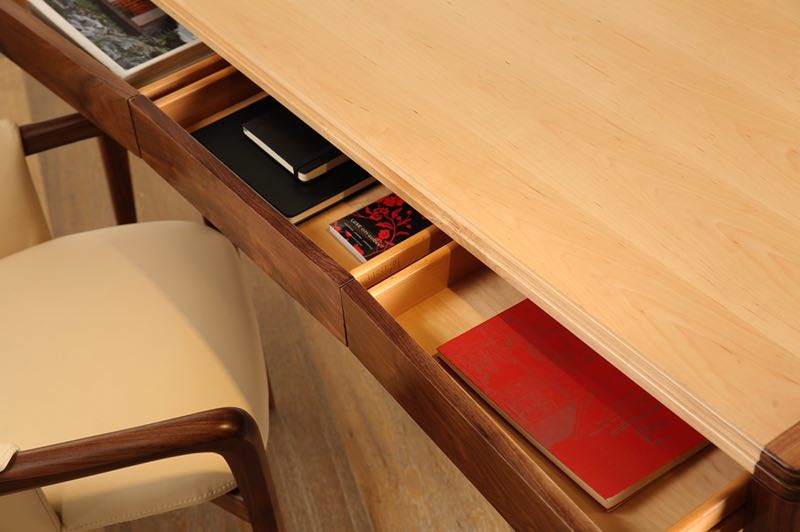 作品体现出简易美学的原理,工艺考究,造型优雅。自然木纹理办公桌共有三个抽屉,可以极大满足储物空间,并且在桌子的侧面还安置了电源插座,可以为移动设备及时、快速充电。它为年轻一代消费群体提供了兼具艺术美学、高品质工艺及实用性功能的产品。也满足了他们对轻松、舒适生活方式的需求。