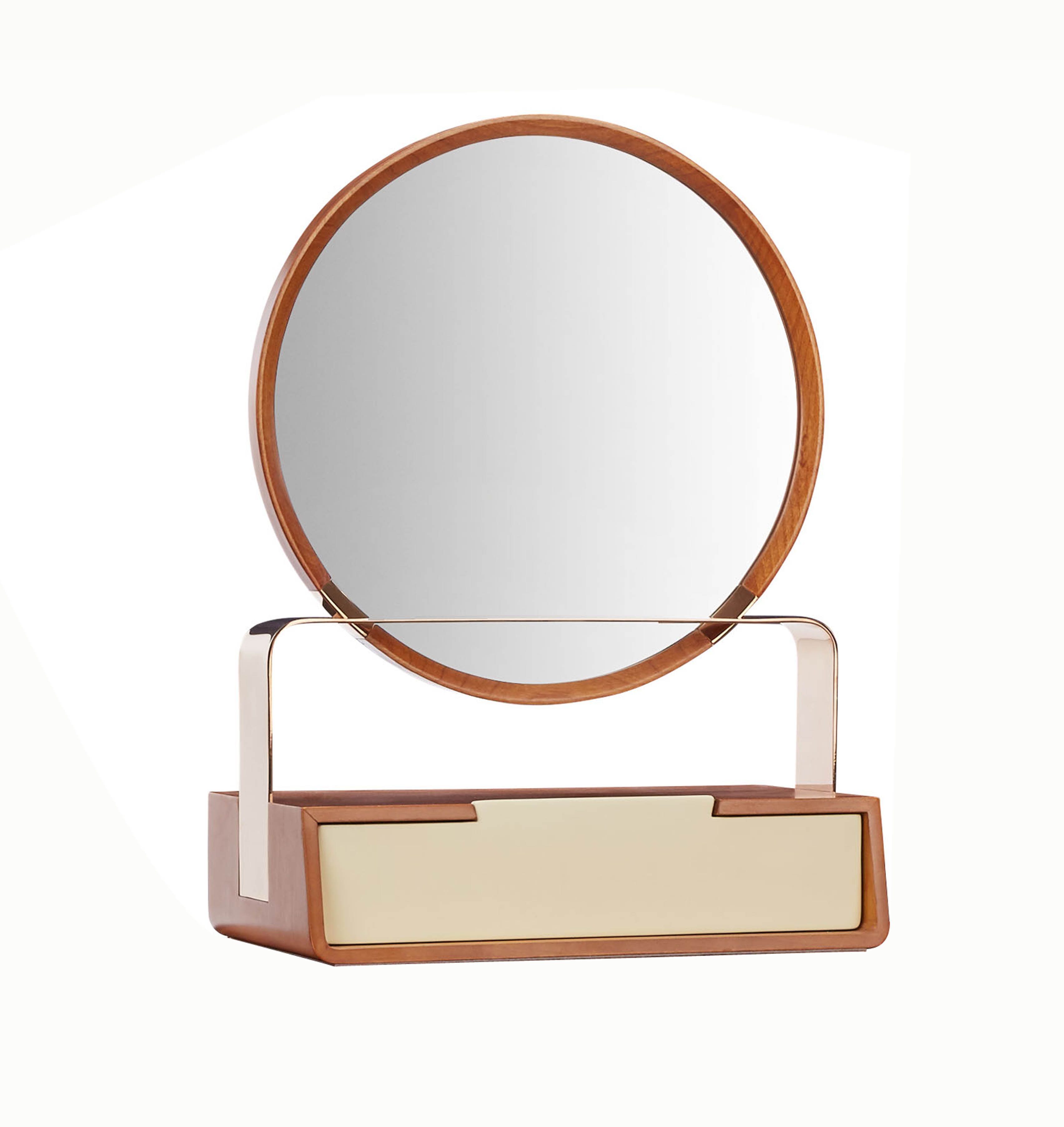 按中国“提篮”的造型设计而来的梳妆镜,精巧中颇具韵味,镜面与桌面可分离,镜面下方的小抽屉面板采用燕尾榫造型,呼应整体调性。抽屉面采用燕尾榫,美观而又实用;铜脚,赋予中式韵味的同时以防磨损;玫瑰金的金属装饰更符合年轻品味。