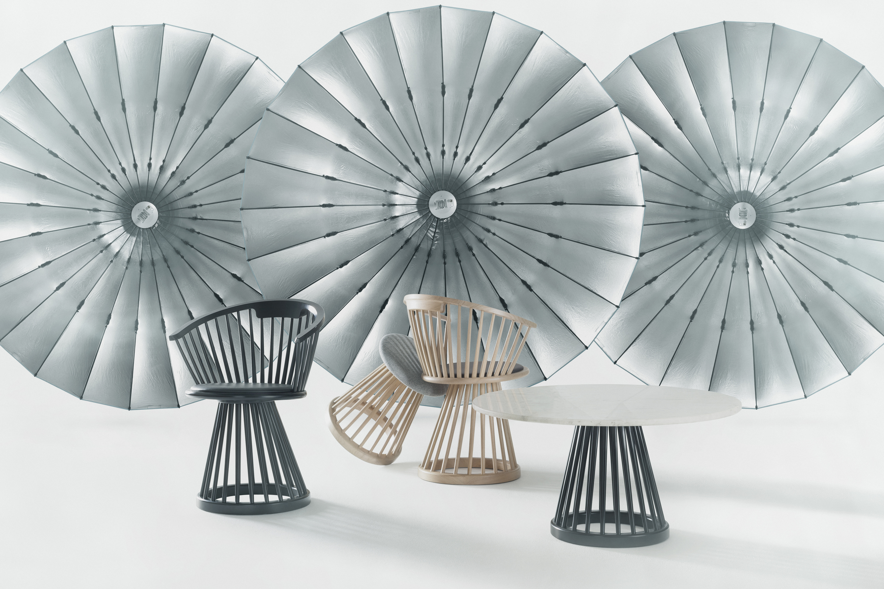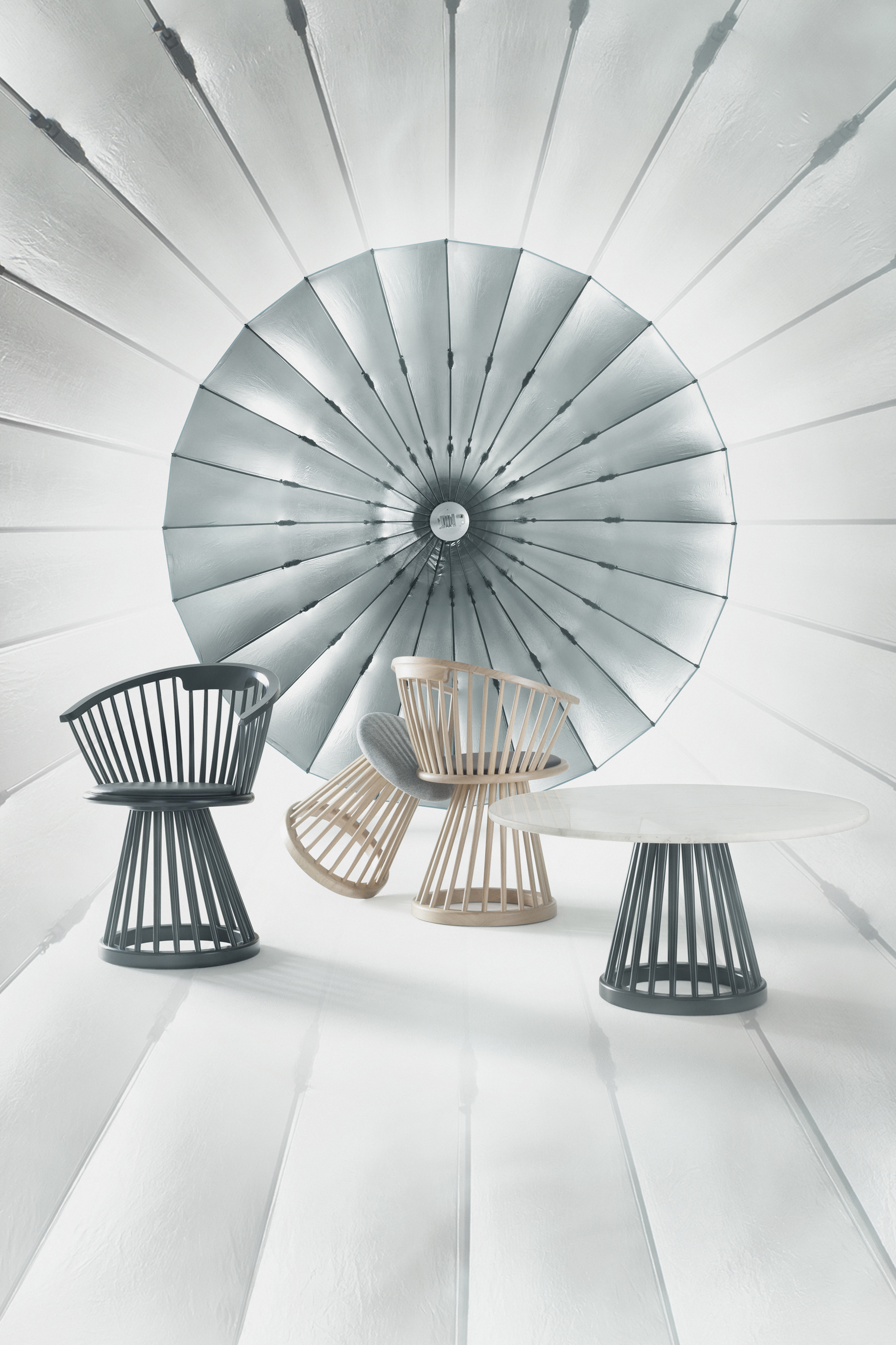 最初是一个戏剧性和雕塑的经典英国设计,风扇是作为一个高背椅,餐椅,凳子和桌子。凳子和椅子有一个黑色的皮革座椅垫,而椅子的特点是弯曲的背部,提供支持和舒适。可选用黑桦树或天然橡树。