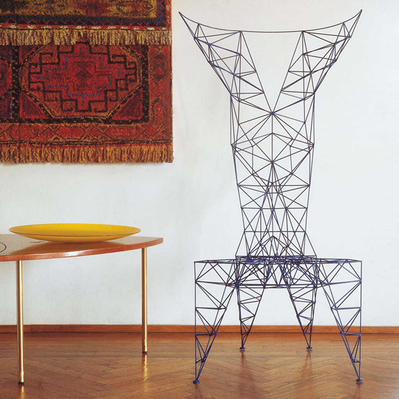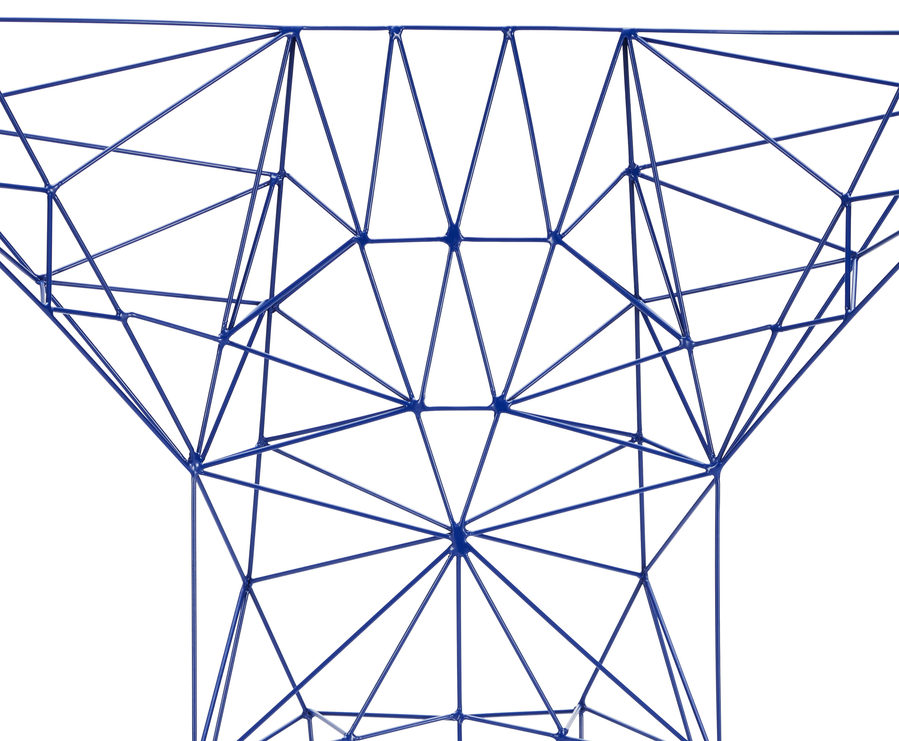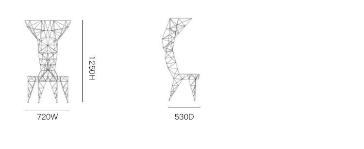 3mm直径钢杆的晶格功是最大强度的三角化-这是一种在纯朴素结构中的练习。最初的灵感来源于早期的电脑编程、电塔和桥梁的建筑模型都清晰可见这是自学结构工程的快乐练习。现在粉末涂在明亮的皇家蓝色的塔椅,虽然可能不是世界上最舒适的椅子,却是最可识别和独特的。