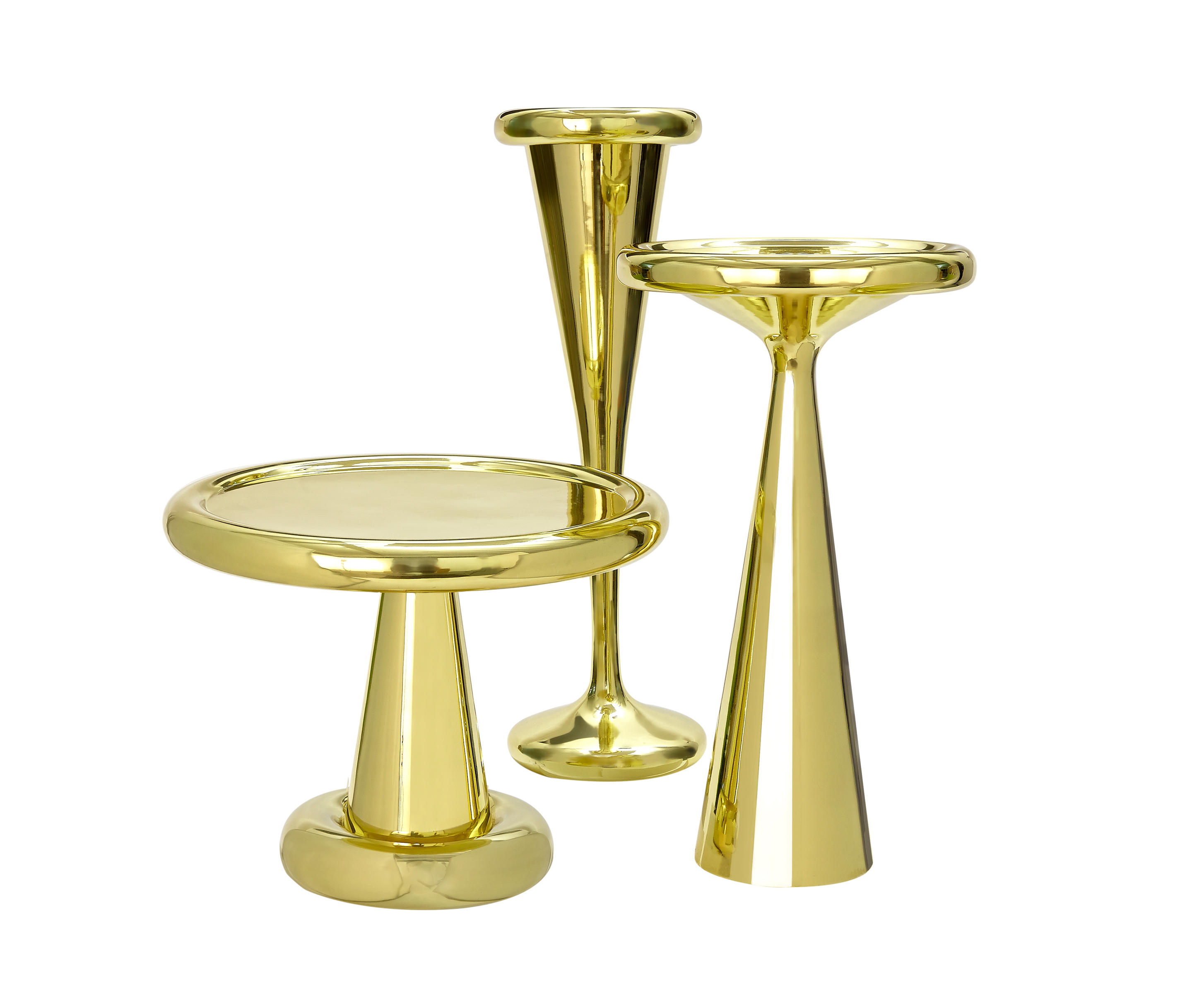 由Tom Dixon Space age, Art Deco or Pop设计的2013 Spun-sheet solid brass bronze——这三件极具表现力、偶尔会出现的家具,每个人都看到了不同的影响。她说:“这是一件非常漂亮的作品。它的比例非常大,用手工抛光的纯黄铜薄板做成的曲线状,使鸡尾酒吧、餐厅或客厅立刻焕发出迪斯科的魅力。”