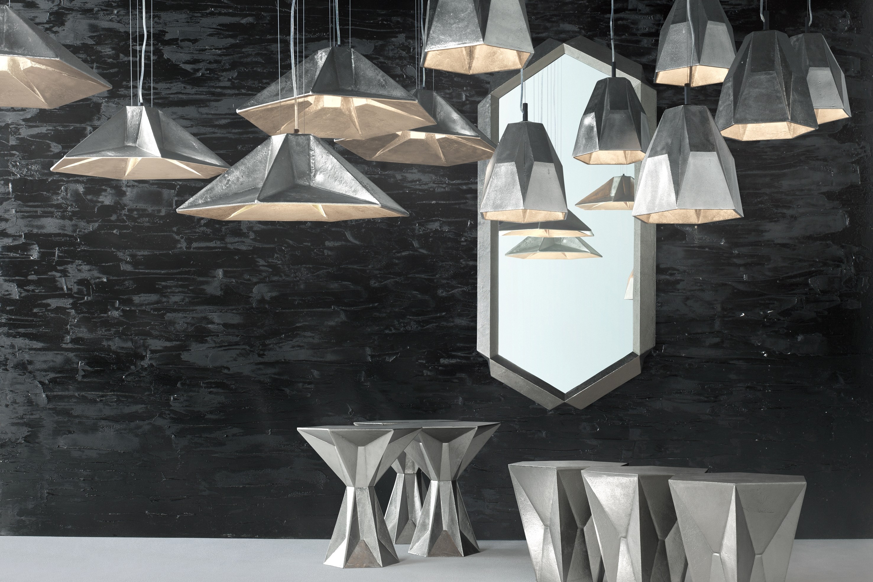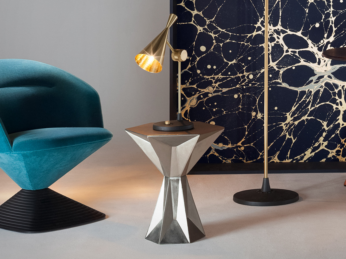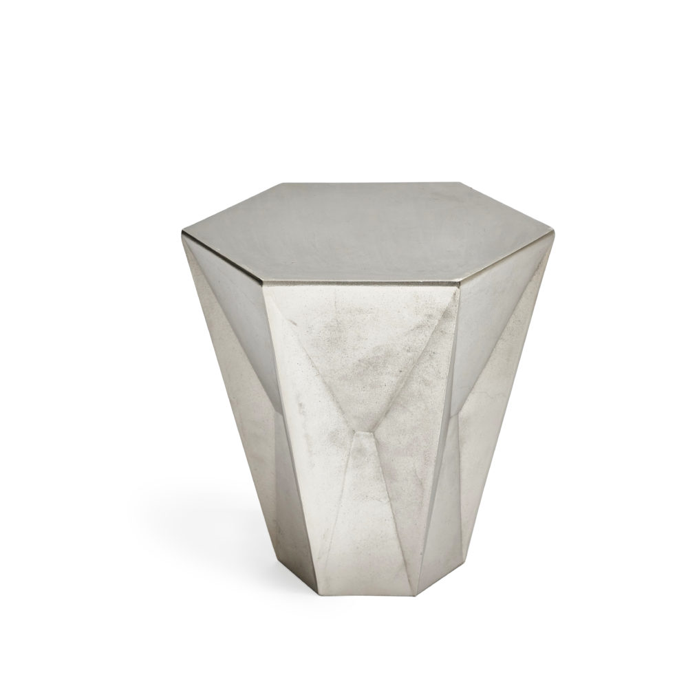 Gem系列以半宝石和银锭的形状为基础.Gem Table Low是一种由镀镍铝制成的坚固块状物,由半宝石和银锭组成.Bearing 六角形桌面在其身体上有角度压痕,强化了它的宝石名称。