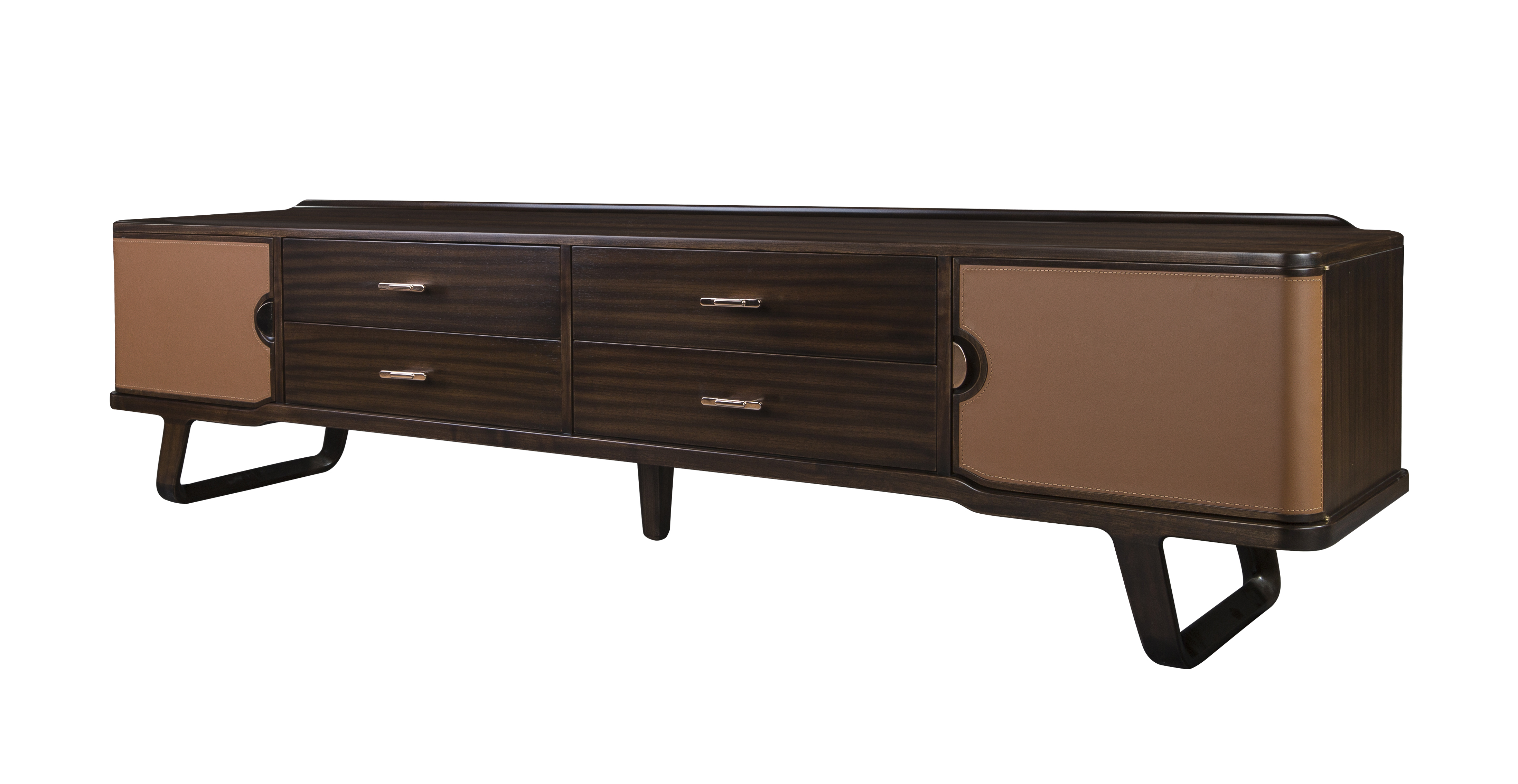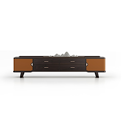 1.造型简洁,以线为主,明朗轻快。 2.腿部内收,上收下分,具有很好的视觉稳定感,稳重大方。 3.双色设计,对比明快,增加视觉跳跃感与家具层次感。 4.纯铜拉手,赋予价值感与独特中式韵味。
