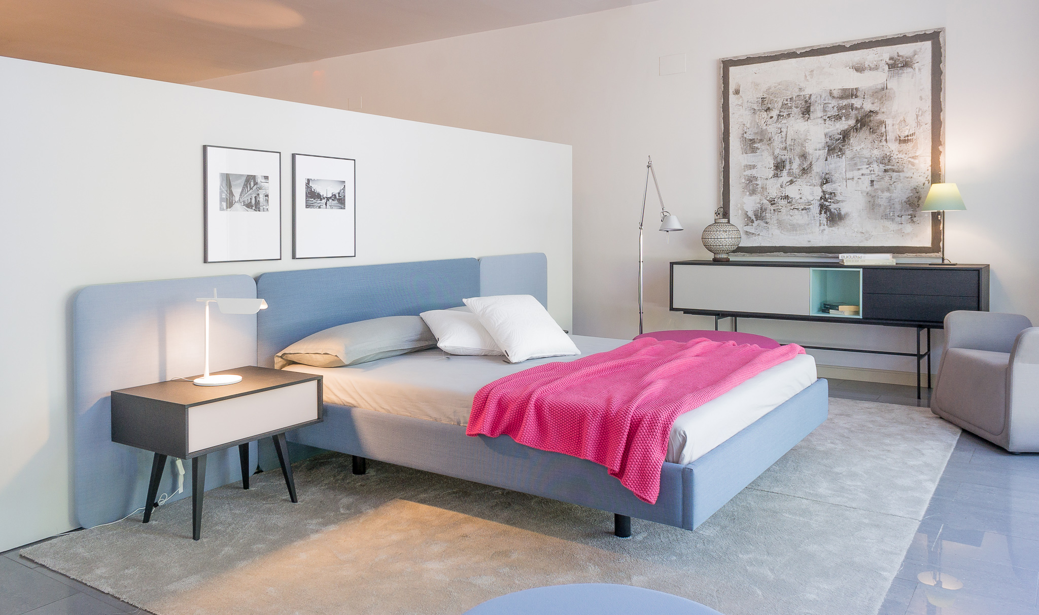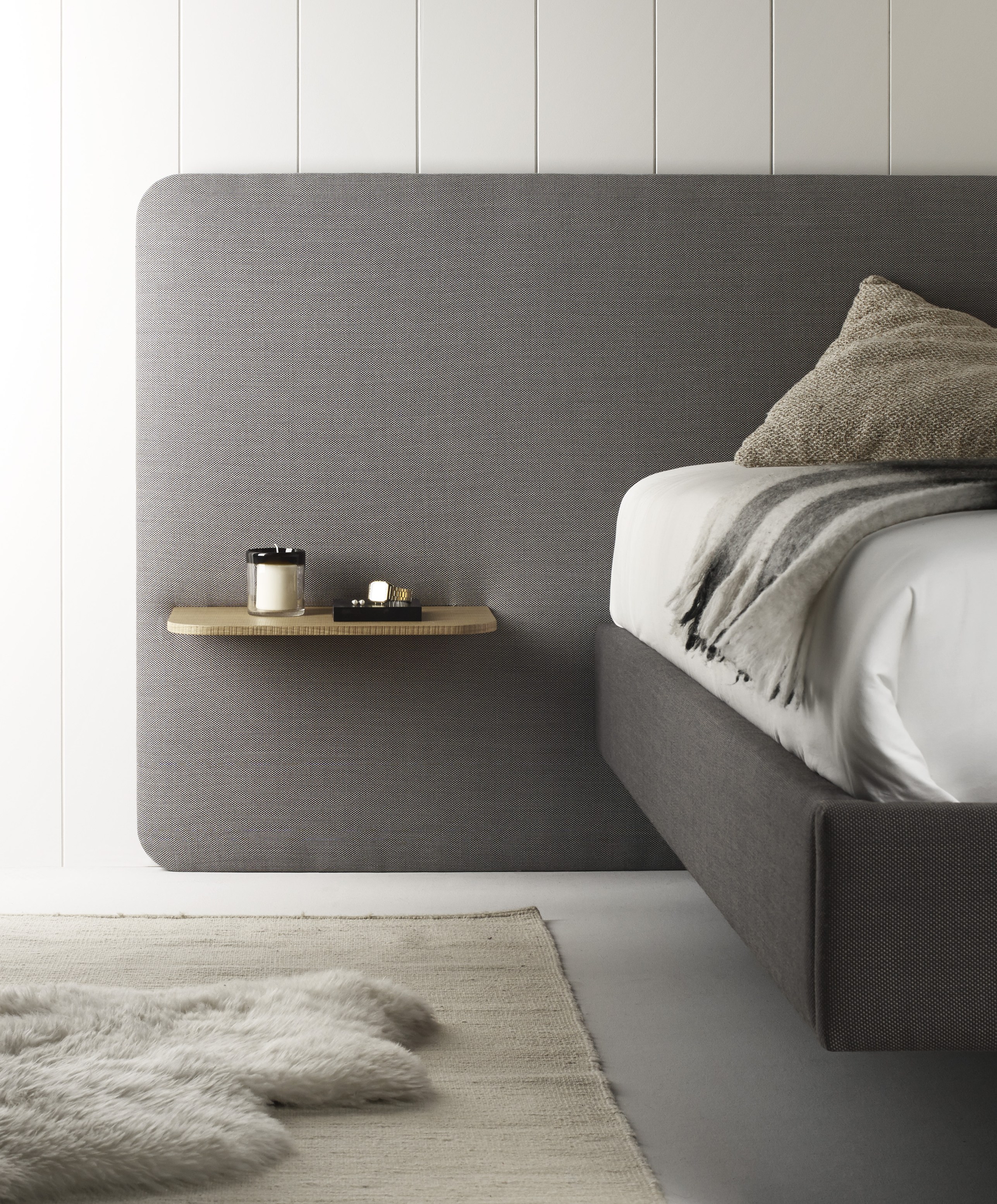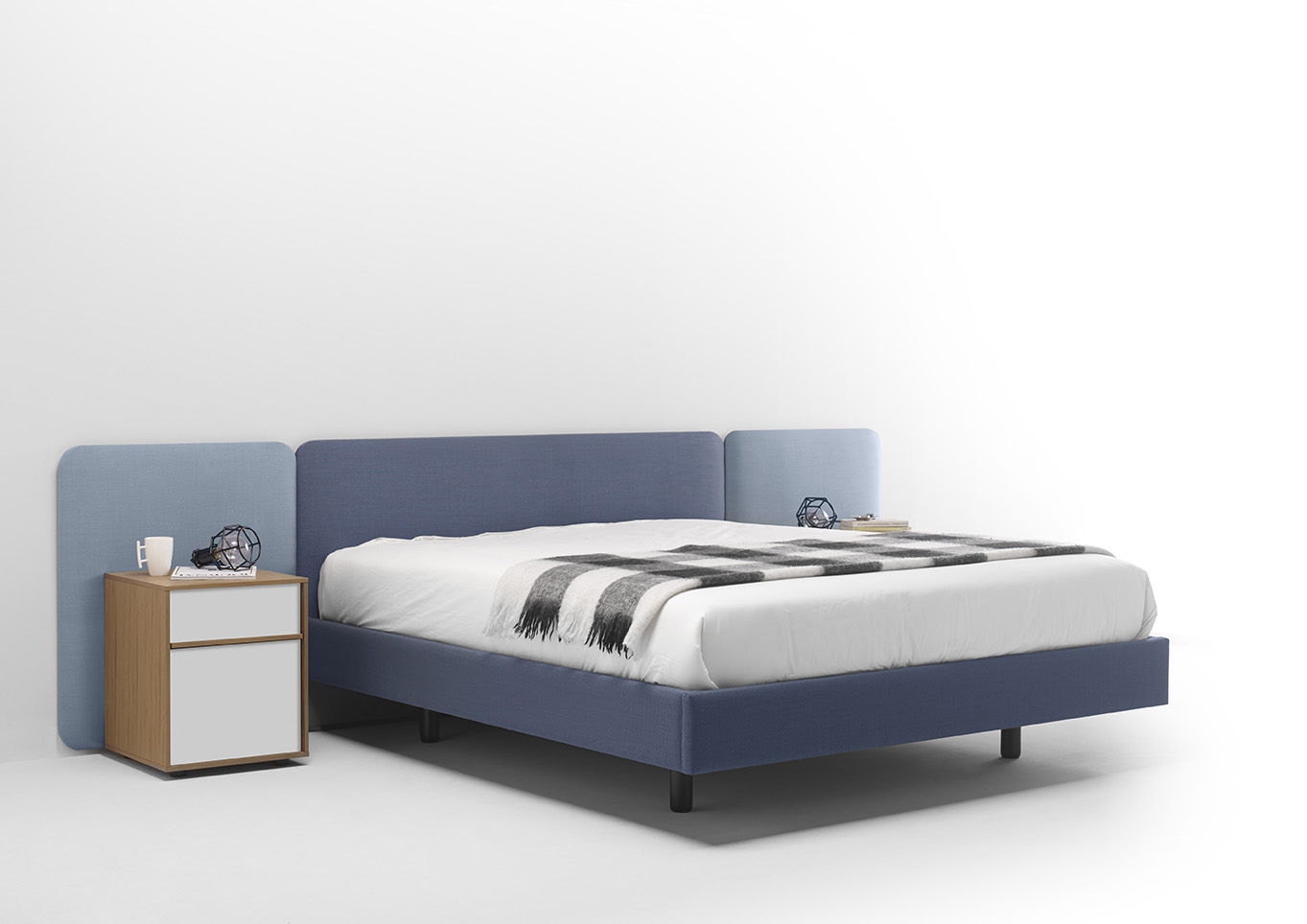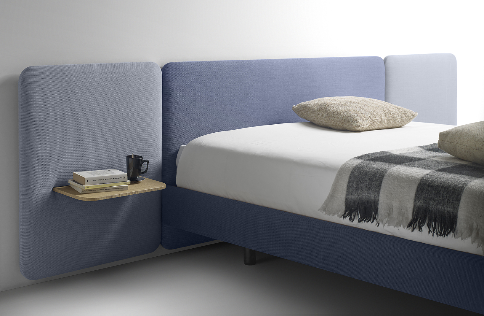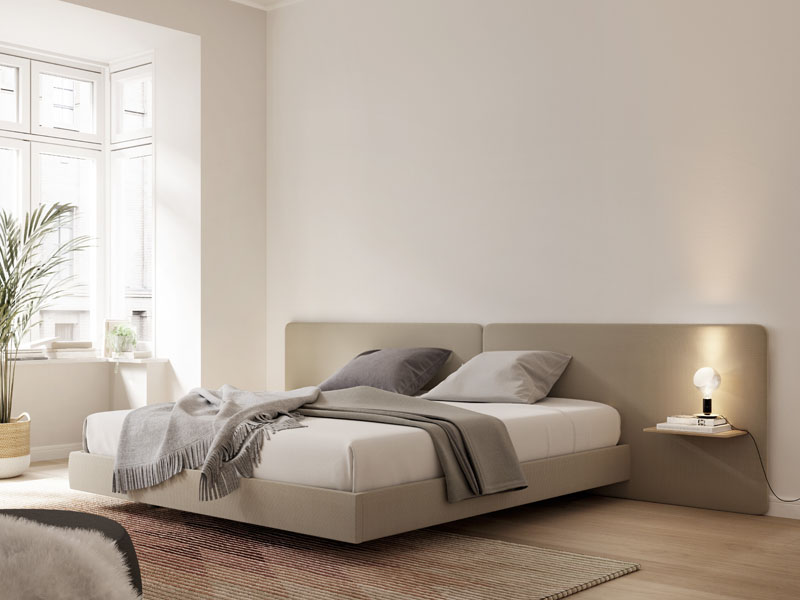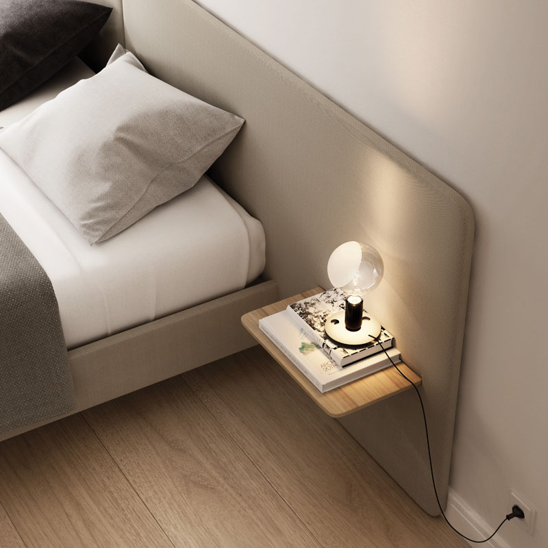 不同宽度和高度的圆形嵌板,不同颜色的织物组合,浮动的书架和有抽屉的床头柜:用Lota系列为你的卧室增添你的个人风格。