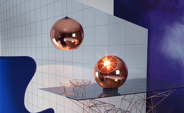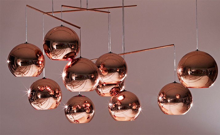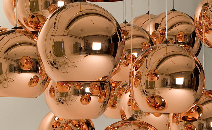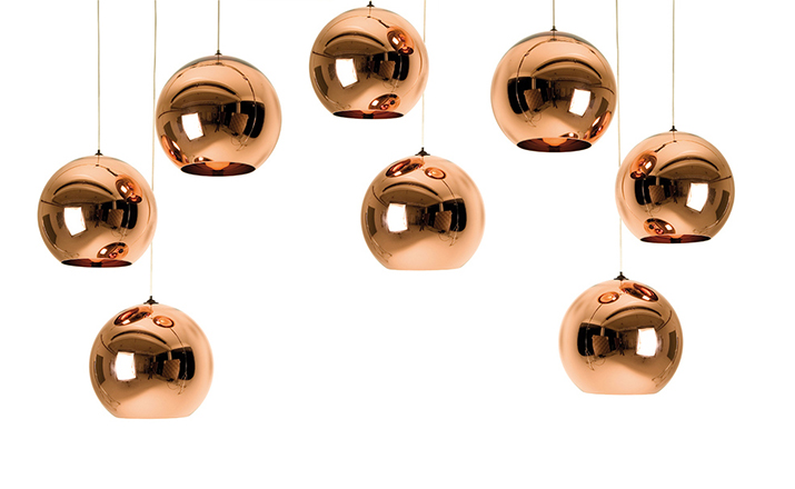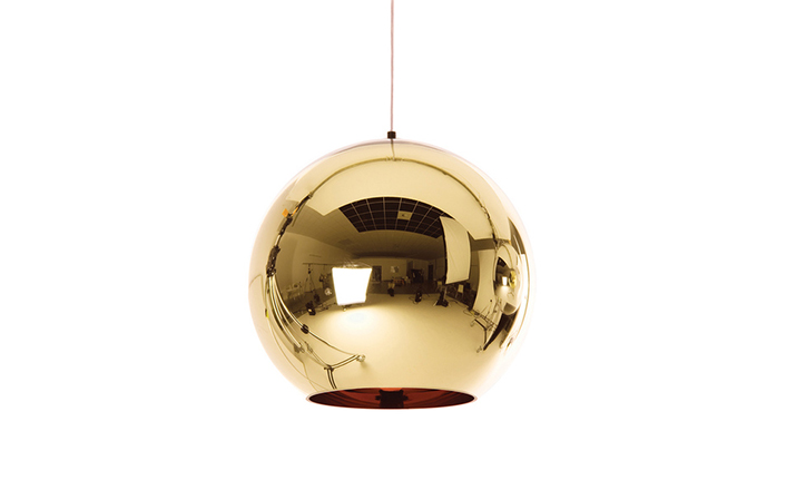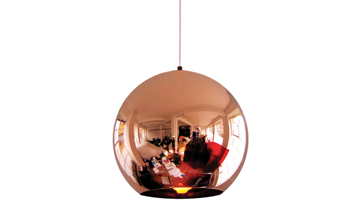 A pendant light made using copper, a material more commonly associated with solar cells and microwave radiation. The Copper Shade is created by exploding a thin layer of pure metal onto the internal surface of a polycarbonate globe. The result is a highly reflective surface with a warm metallic glow.
