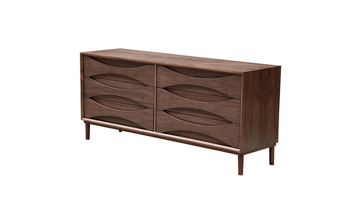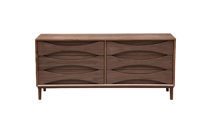 arne vodder retro lowboy dresser(arne vodder复古短脚衣橱梳妆台)是Kardiel公司制作的经典实木家具,具有世纪中期的现代风格,6个滑动式抽屉通过精心制作,提供足够的空间存放衣物或其他物品。在现代主义的存储家具上, Finn Juhl和 Arne Vodder 最先尝试胶木和天然木的组合运用。这是大胆的创新,他们结合传统的新鲜的新兴技术与现代主义的概念。制作采用精选MDF板基材胡桃木或水曲柳木皮贴面、胡桃实木或水曲柳实木脚架、环保油漆喷涂、做工精湛。