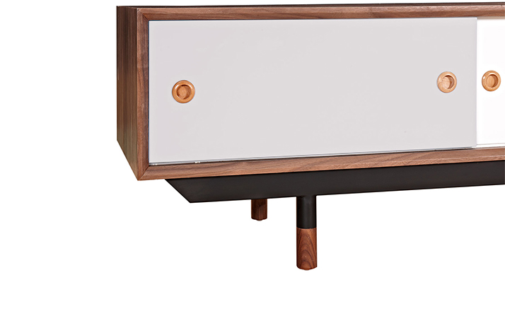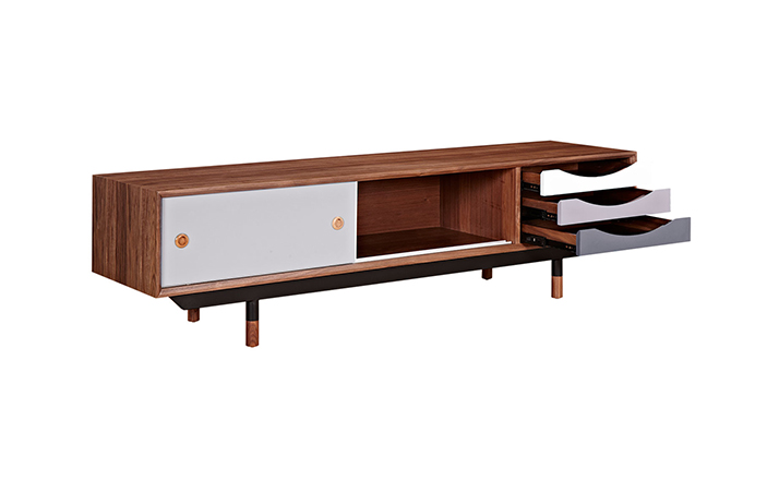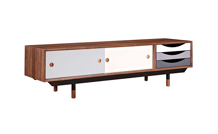 color theory media cabinet(色彩原理电视柜)是Kardiel公司制作的经典实木家具,具有世纪中期的现代风格,设计于1955年。配有三个梯度的滑动抽屉和两个隐蔽的推拉门的小隔间,存储容量非常大。在现代主义的存储家具上, Finn Juhl和 Arne Vodder 最先尝试胶木和天然木的组合运用。这是大胆的创新,他们结合传统的新鲜的新兴技术与现代主义的概念。制作采用精选MDF板基材胡桃木或水曲柳木皮贴面、胡桃实木或水曲柳实木脚架、环保油漆喷涂、做工精湛,是您理想的选择。