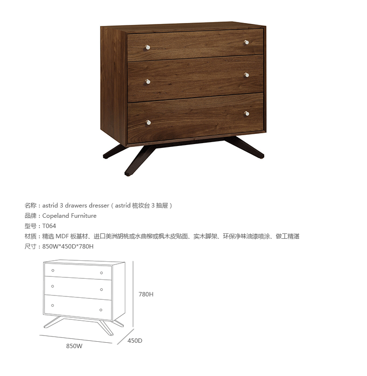 astrid 3 drawers dresser(阿斯特丽德3抽梳妆台)是Copeland Furniture公司astrid实木梳妆台系列之一,宽大的八字形脚架非常吸引人注目,制作并非易事,它其实是一个大工程,同时能引发无限期望和激情,3个平滑抽屉,可以给与提供许多存储空间。制作采用精选MDF板基材、进口美洲胡桃或水曲柳或枫木皮贴面、实木脚架、环保净味油漆喷涂、做工精湛。
