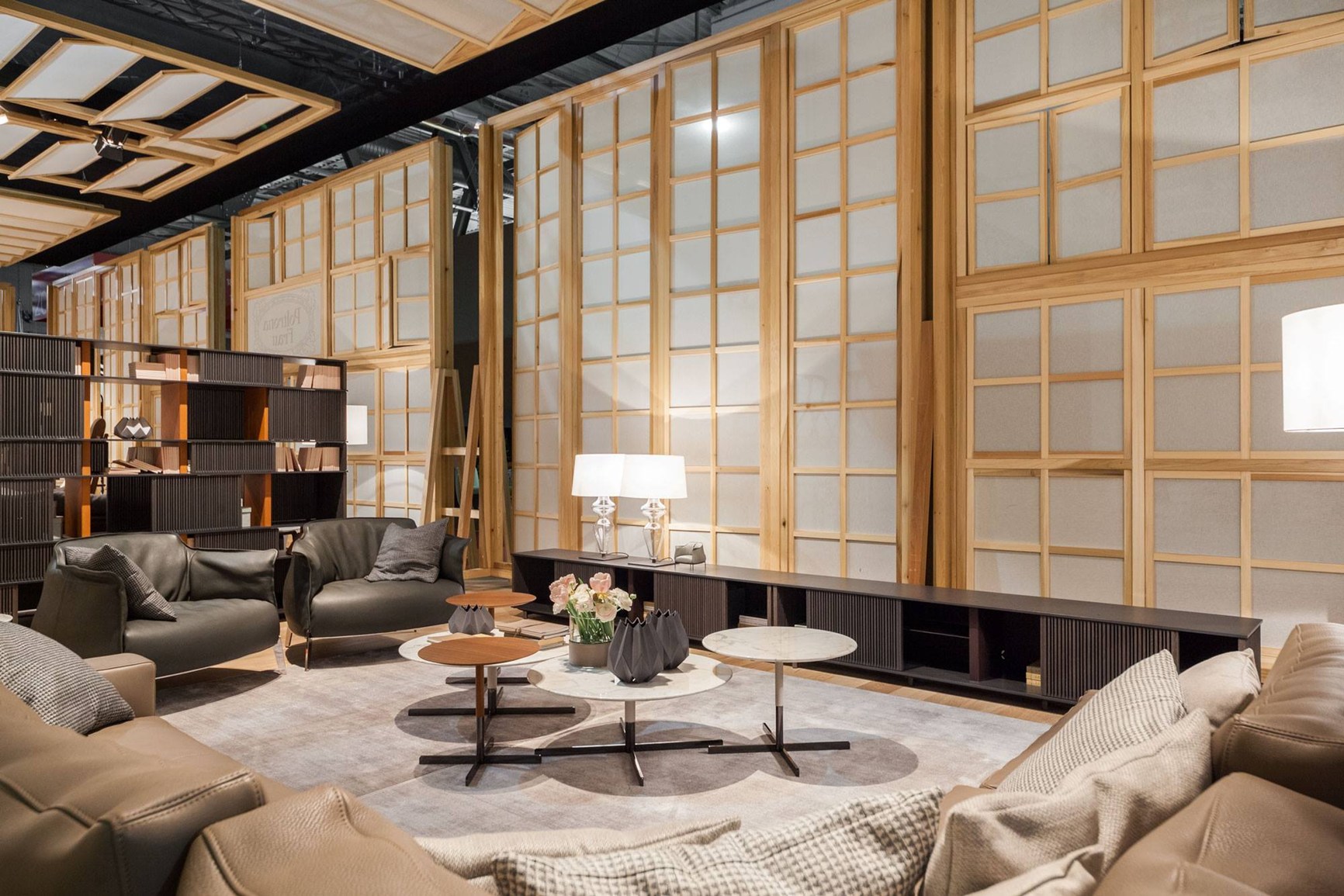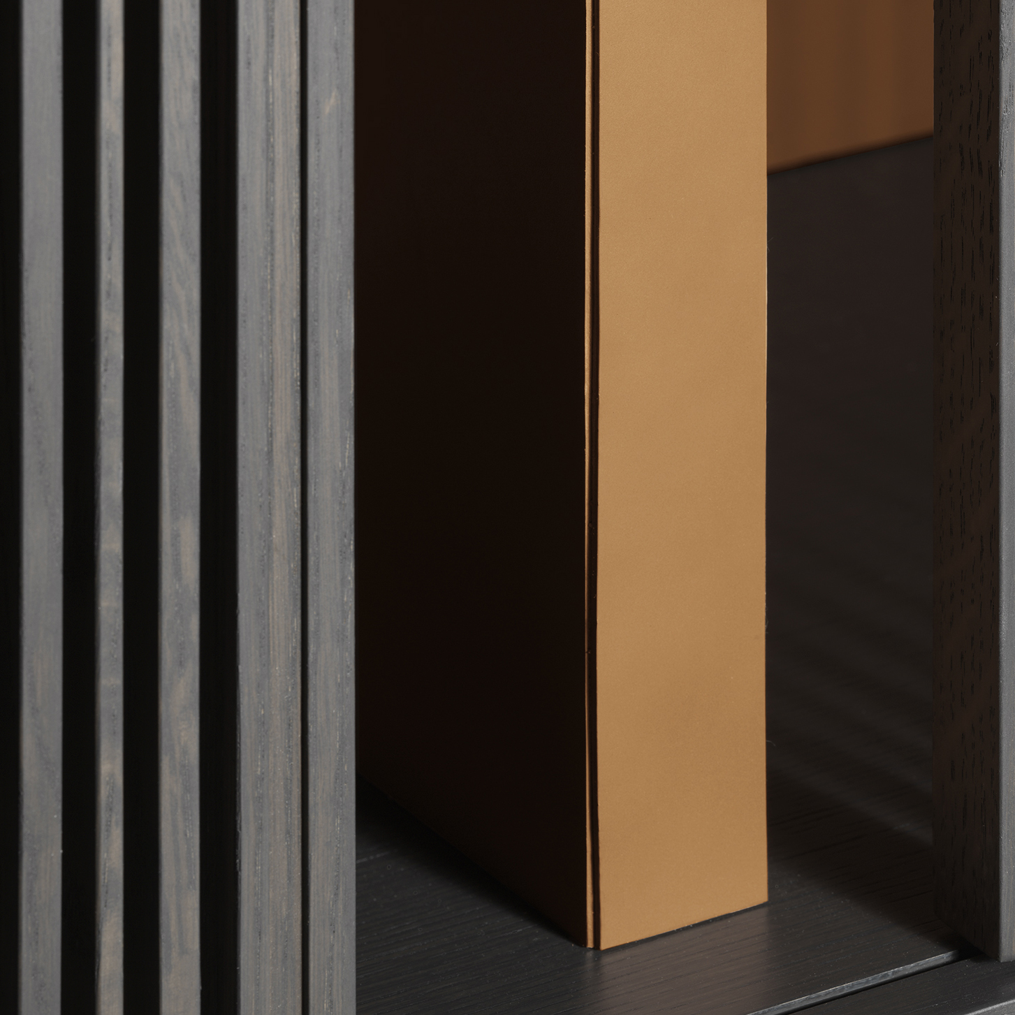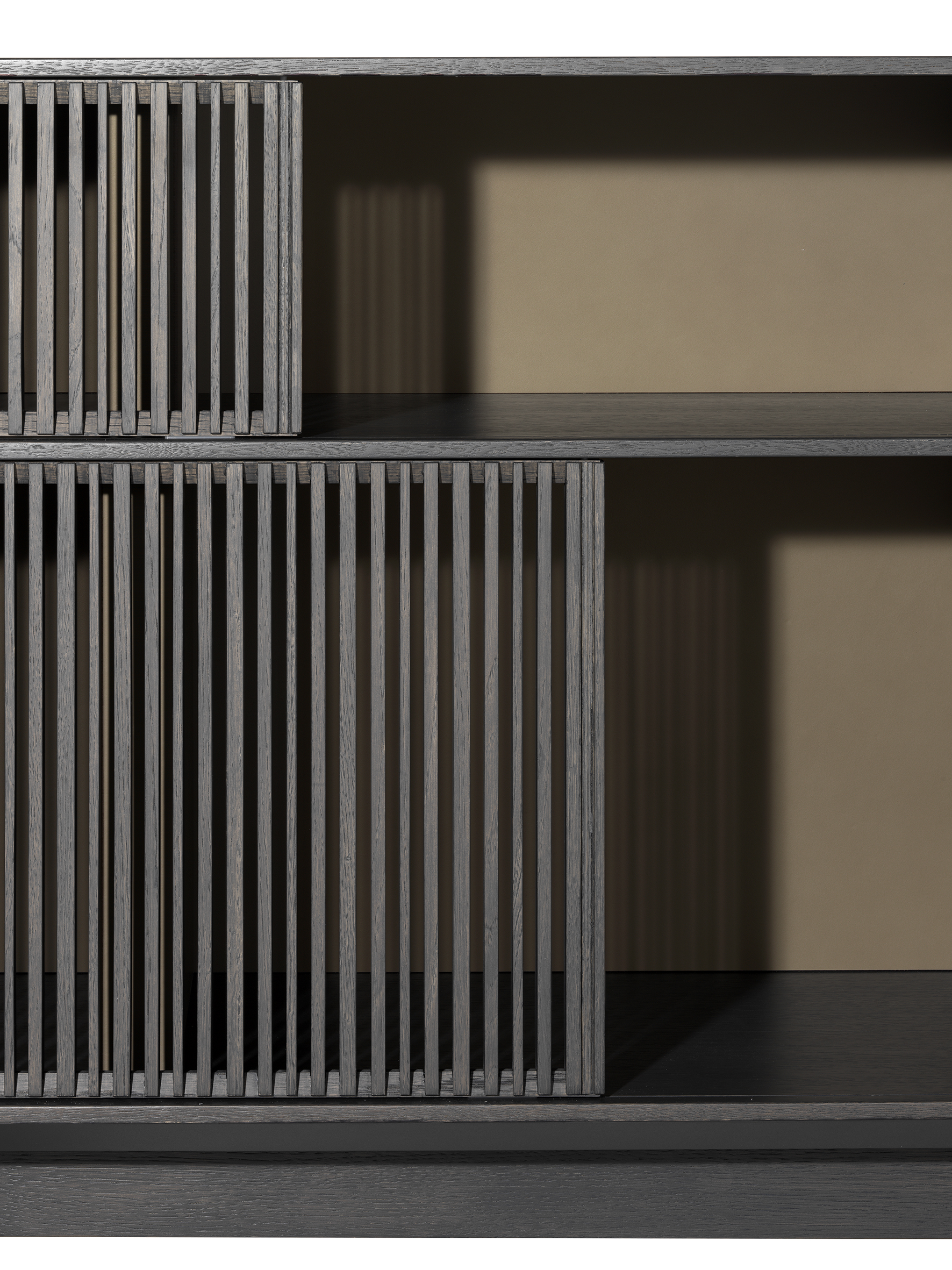 一系列的薄垂直木制棒光网格形式,无形的水平轨道上运行从上到下。 每个网格可以根据需要创建不同的序列