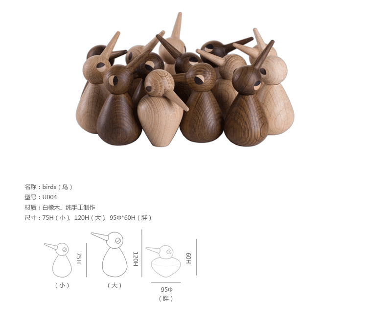 "这些优雅灵巧的鸟儿们诞生于丹麦的一个小镇,工匠们以成熟洗炼的工法,采用烟熏色及原色的橡木纯手工打造制作,整件作品没有用到任何衔接的钉子,每个环节步骤都蕴藏着精湛的工艺技巧,并细心严谨地一个步骤接一个,才能逐步将片片木材刻划成各个活灵活现,充满自由灵魂的鸟儿。