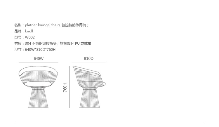 1966年榮獲 American Institute of Architects International Award 美國建築協會國際大獎的 Platner Chair,在設計師 Warren Platner 的創意下,將鋼絲雕塑轉化成一系列收藏級的傢俱,創造了現在被認為是當今時代的設計圖標。