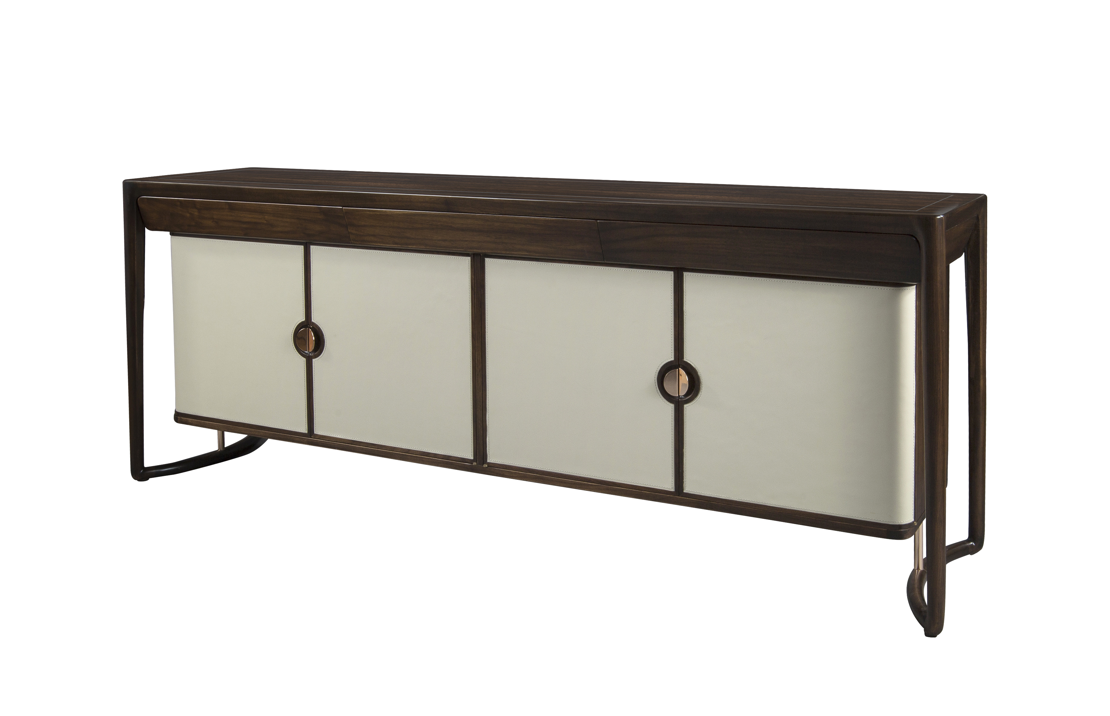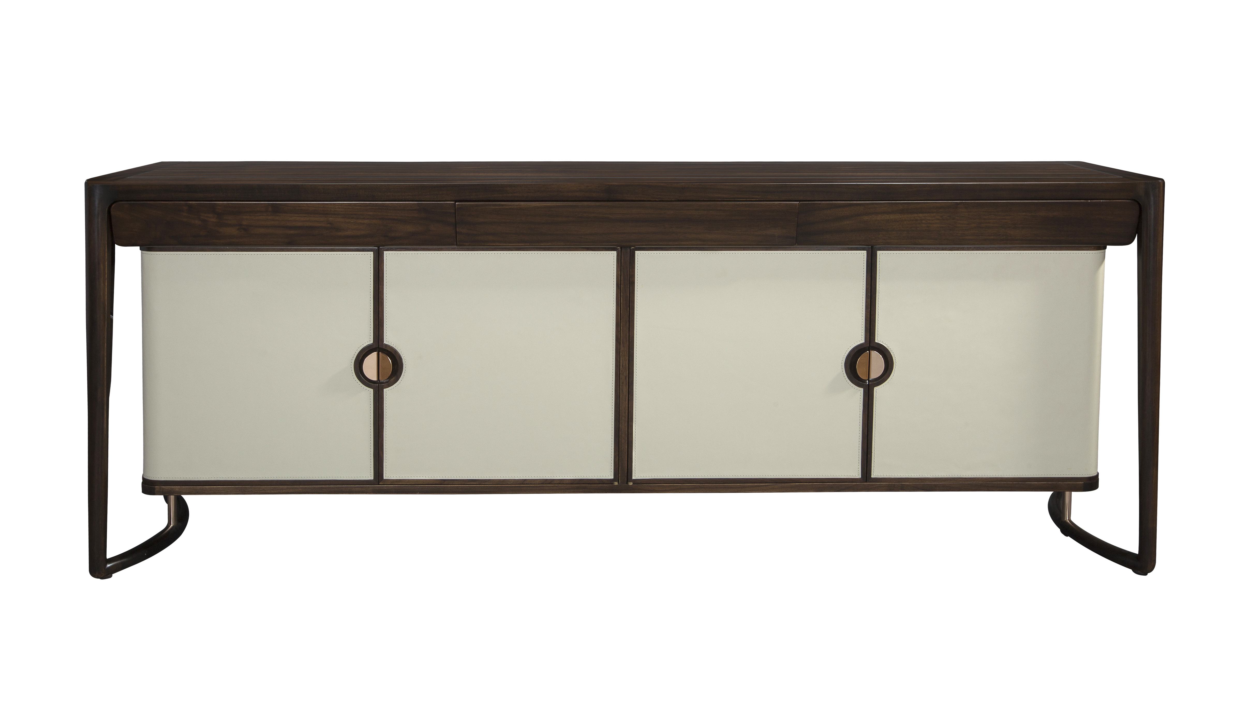 1.造型别致,雅致含蓄,“天圆地方”的理念贯穿整个餐边柜。 2.进口牛皮包饰柜门,质感高雅,搭配自然胡桃木纹,双色设计,纹理精致,极富新海派意蕴。 3.纯铜拉手与铜制拉杆,赋予价值感与独特韵味。
