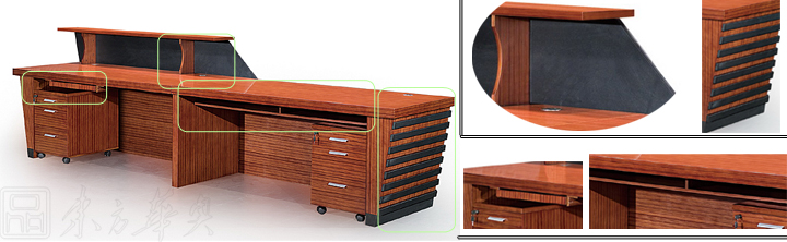 ※ 上图为背面展示图,以及侧面斜度设计,厚实的中部支撑板,实木键盘架,铝合金拉手活动柜,个性设计前台双层板,巧妙的运用银色装饰条点缀,黑色亮光漆的设计造型,完美结合,尽显高档典雅!