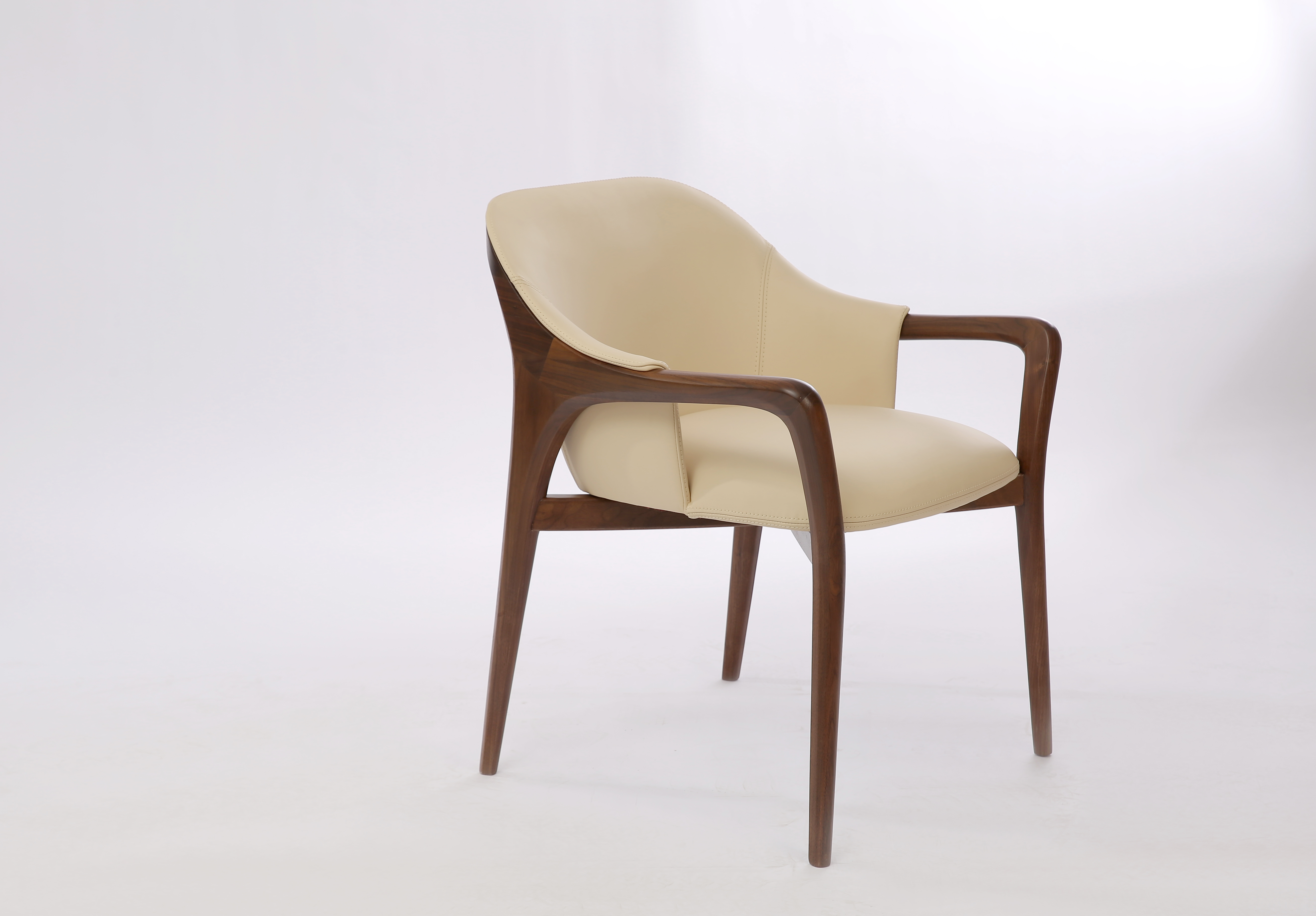 作品精致优雅。为居家办公环境提供一种独一无二的解读方式。表达轻松愉悦的生活态度。材质上采用坚硬的胡桃木,现代材料玻璃钢内衬,造型上体现人体工学原理,柔软牛皮包饰的坐垫与靠垫,让倚靠及坐姿更加舒适。