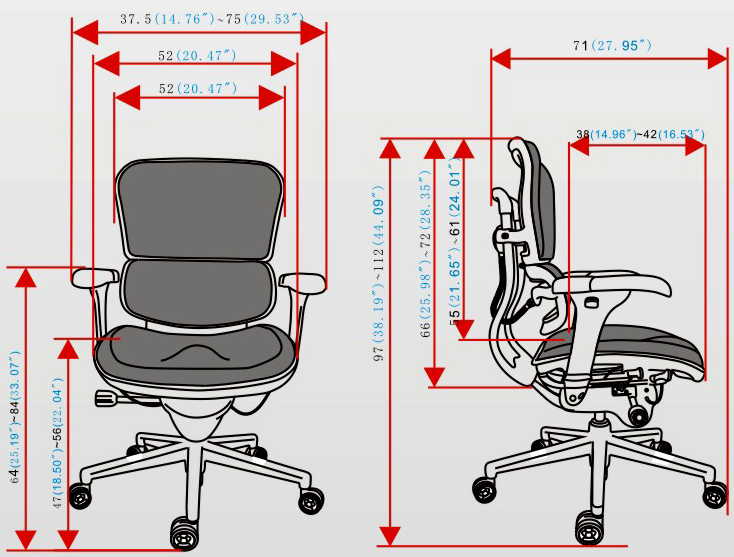 头枕、背垫、腰枕及座垫均为进口网布;黑色塑胶框架,PU扶手垫;塑胶头枕插条、头枕横把手;背支撑架、底盘支撑架均为铝合金精抛光;100MM气压棒,340MM铝合金精抛光椅脚,60MM PU滑轮;