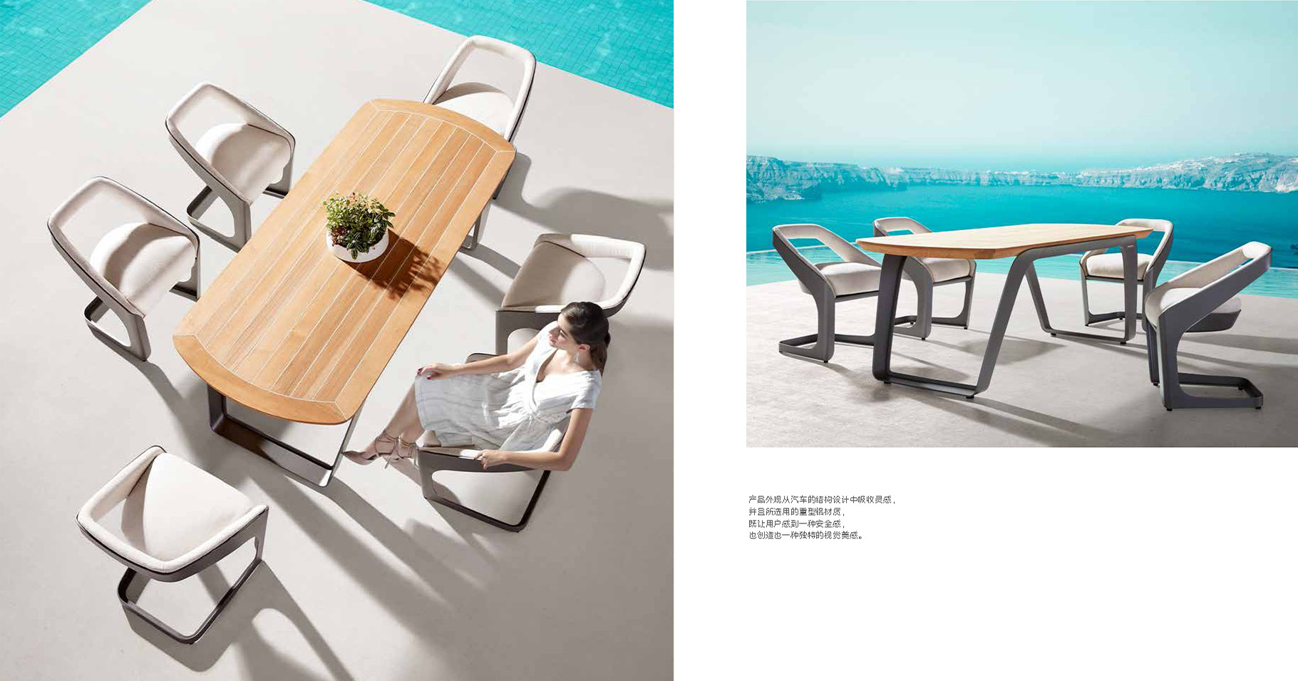 设计灵感:动感的海浪 “奢华”---奢华原创独一无二 “革新”---6mm铝板整体成型和无缝焊接+TIGER牌喷粉+纯天然A级缅甸柚木,搭配顶级环保用材,技术革新 “优美”---游艇SUNBRELLA 布艺,超厚快干棉异形切割,体现完美形态,满足全天候的户外条件 “多变”---30多种搭配组合,精选3种主流颜色,室内室外搭配随心所欲 “细致” ---防水布罩,多功能卡扣,防霉里布,蜂窝纸箱,细致入微,解决您的后顾之忧